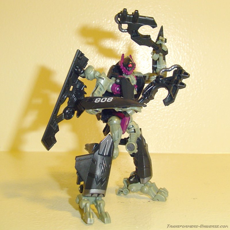 Skystalker is more than happy to let Divebomb, in his new form, take fire from Scattorshot. While his partner is busy getting his wings singed, Skystalker is swooping in from behind in stealth mode, preparing to snatch the hapless Autobot and carry him off into the sky.