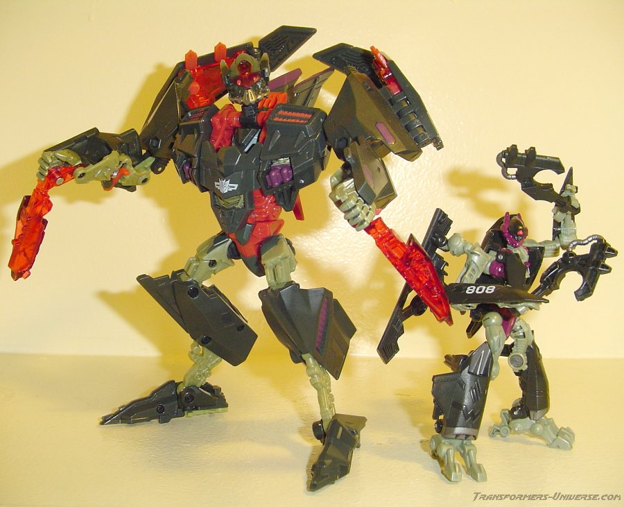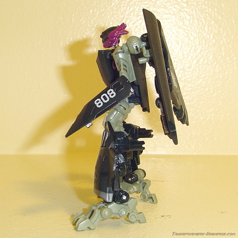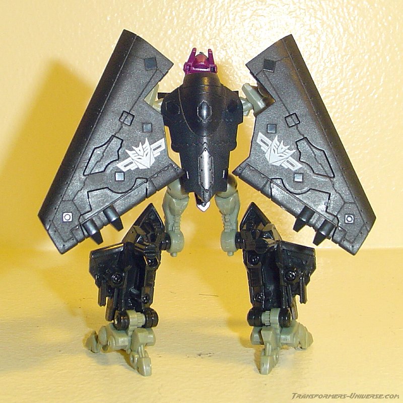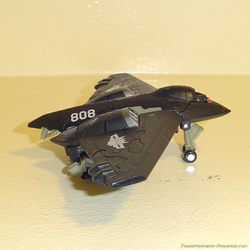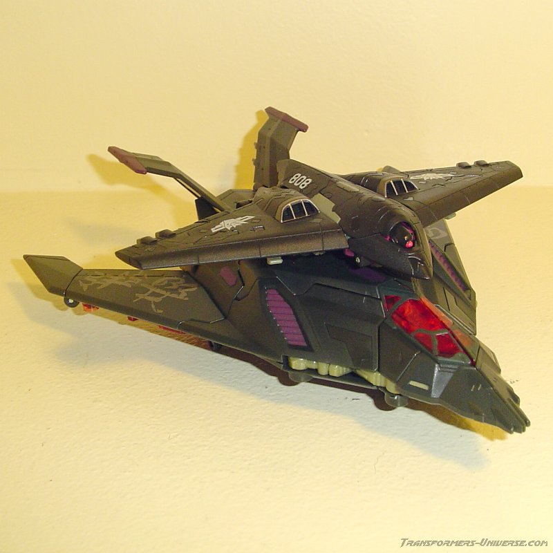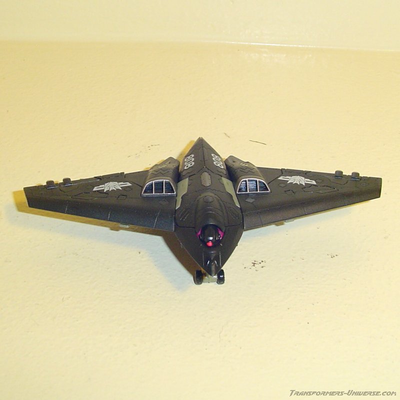 Attack Mode: Transform him from robot to vehicle, but leave his feet in a chicken fashion. This is Hasbro’s attempt at getting sued over the Gerwalk configuration again (See G1 Skyfire/Jetfire). If you tilt the wings and nose down it makes a raven like beast mode.