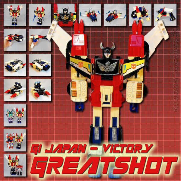 Remarks: Greatshot appeared in several episodes of Victory. A former mercenary who joined the Cybertrons/Autobots, he fought his former comrades Guyhawk, Blue Bacchus and Black Shadow alongside Star Saber and was also present for the final battle against Deathsaurus' huge space fortress. He was portrayed as the stereotypical ninja-loner for the most part. Some people consider him an upgraded version of Sixshot, who switched sides to join the Cybertrons in the Headmasters series, but there is no evidence to support that other than the two of them sharing the same voice actor in Japan.