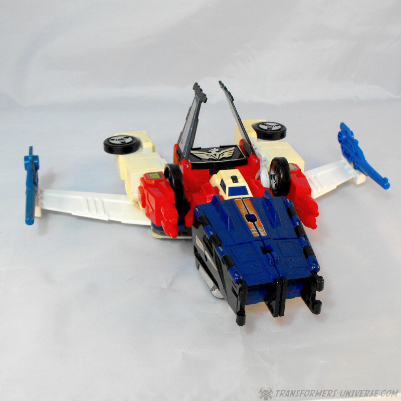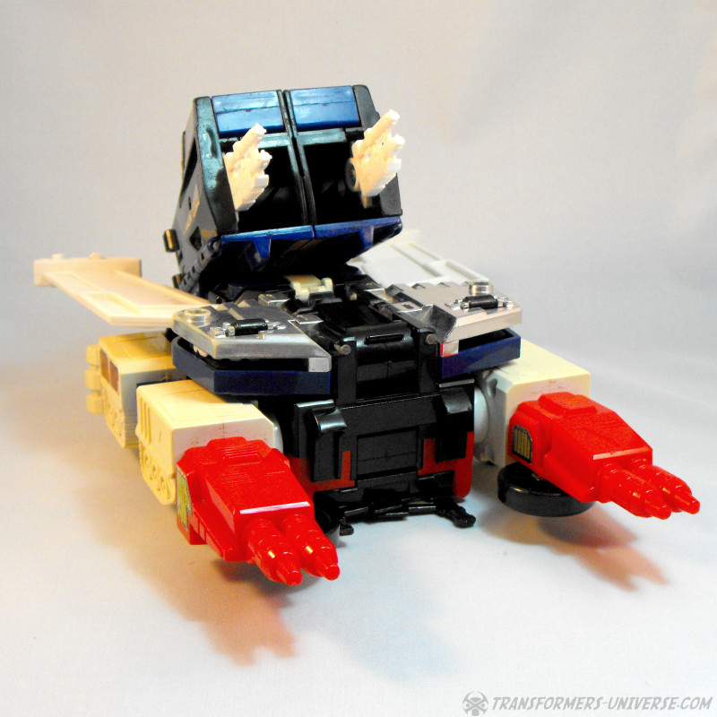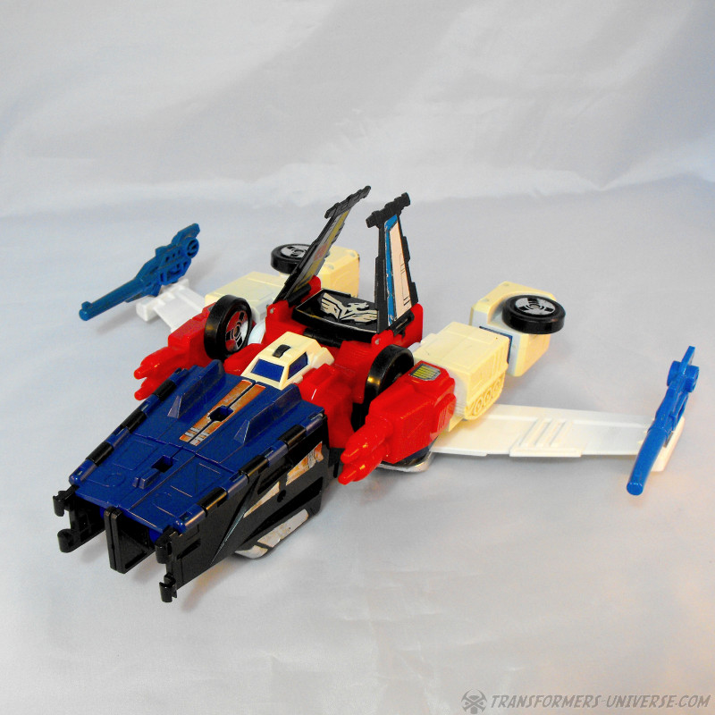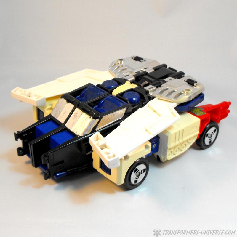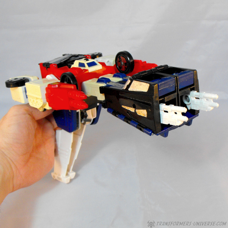 The fifth mode is a car. Let’s leave aside the question what you need a car mode for when you already got a tank for a ground-based alternate mode. The vehicle looks like a mixture between a Jeep and a Hummer, but suffers a bit from having the red shoulder pieces / barrels sticking out back and the jet wings forming the roof (while still being very recognisable wings). A functional, but not very pretty and hardly necessary car mode.