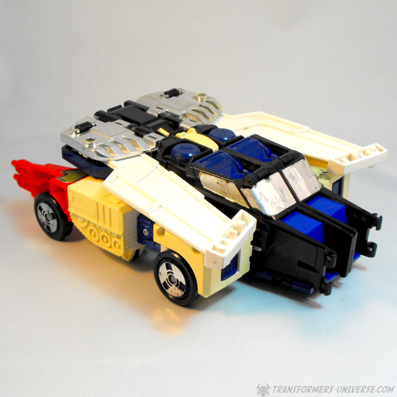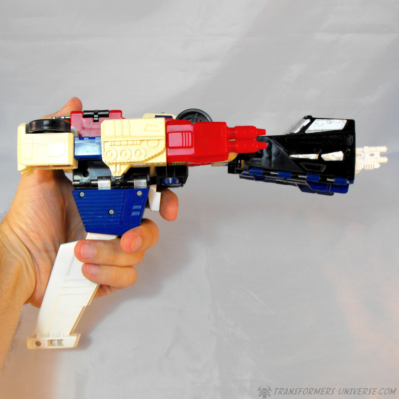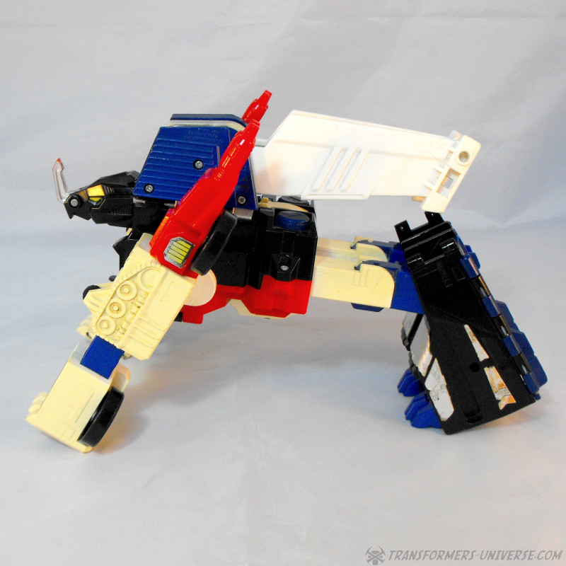 Where Sixshot become a wolf, Greatshot has swapped the animal head for... well, something with a horn. I’d say a rhino, but considering that the rest of the body doesn’t really look very rhino-like, let’s just say it’s a four-legged animal with a big silver horn. And no, it’s not a unicorn, unless it’s one on serious steroids and with claws instead of hooves. Anyway, the horned animal looks pretty good for all that his limbs are somewhat out of proportion and it can extend the wings, too, giving Greatshot a sixth-and-a-half mode as a winged horned-animal-that-might-be-a-rhino.
