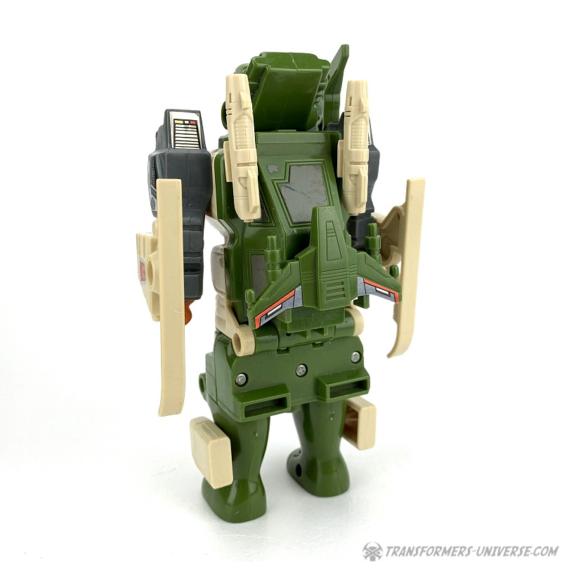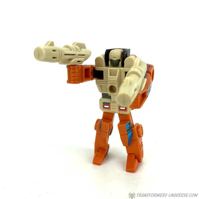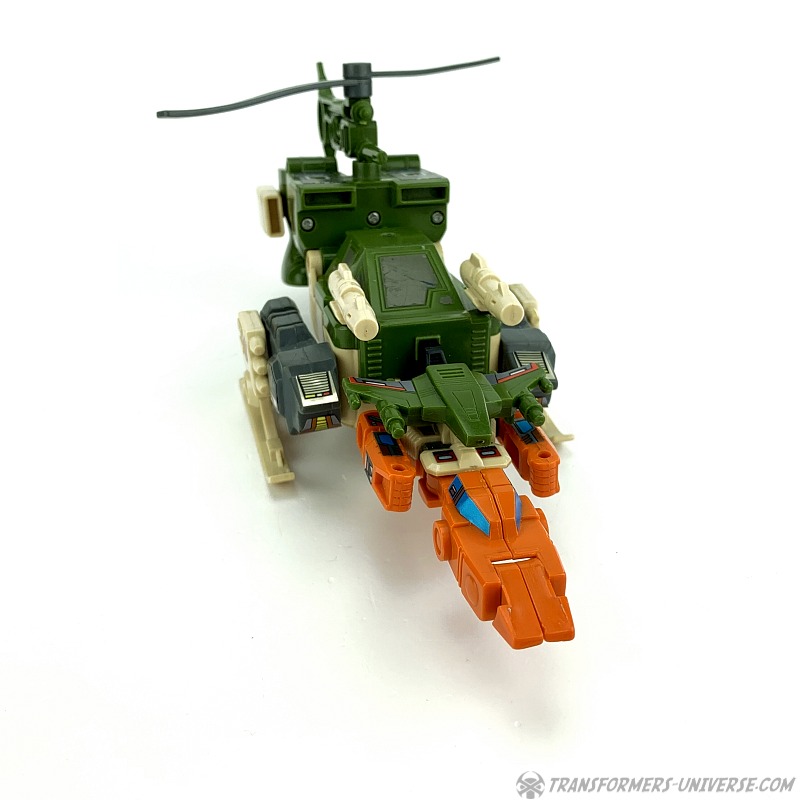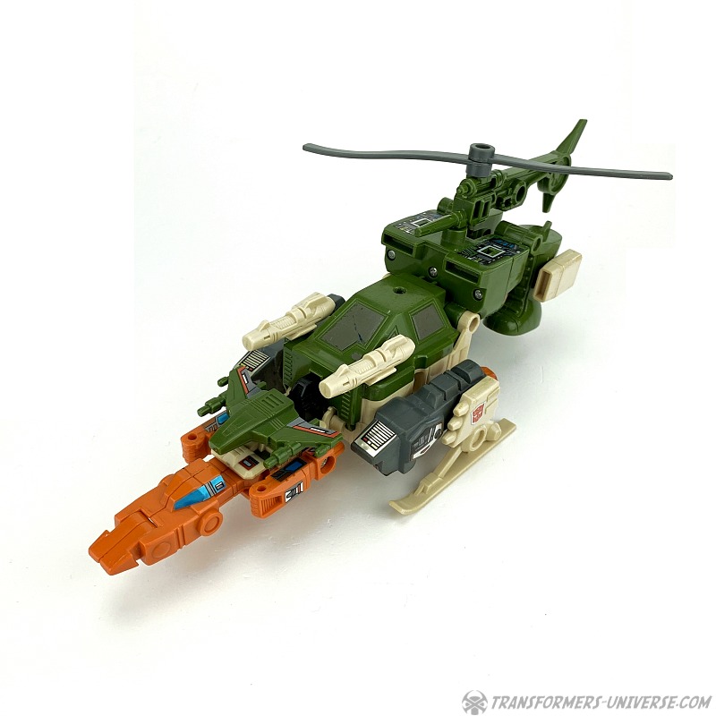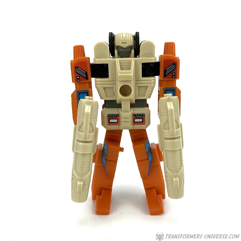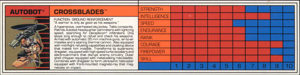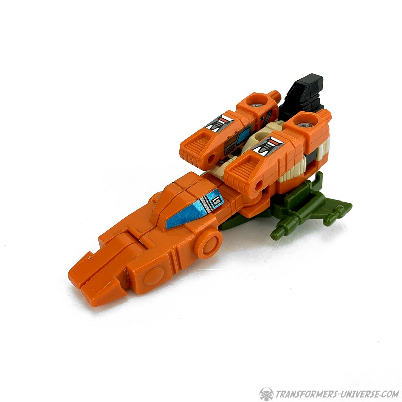 A hyperactive, overheated sky jockey. Talks constantly. Patrols Autobot headquarter perimeters with lightning speed, searching for Decepticon infiltrators. Only stops long enough to refuel and check his weapons. Armed with automatic 35mm machine guns, air-to-air missiles, and a searing thermal cannon. Also equipped with mid-flight refueling capabilities and cloaking device that makes him invisible. Transforms to supersonic dragster, equipped with high-speed turbo boosters and electro-jammers that disrupt enemy circuitry. Outer shell chopper equipped with metal-eating roto-blades. Combines with dragster to form ultra-sonic helicopter equipped with front-mounted magneto-ray that magnetizes on impact.