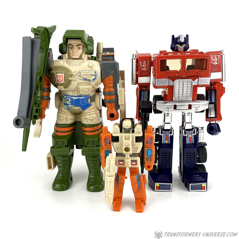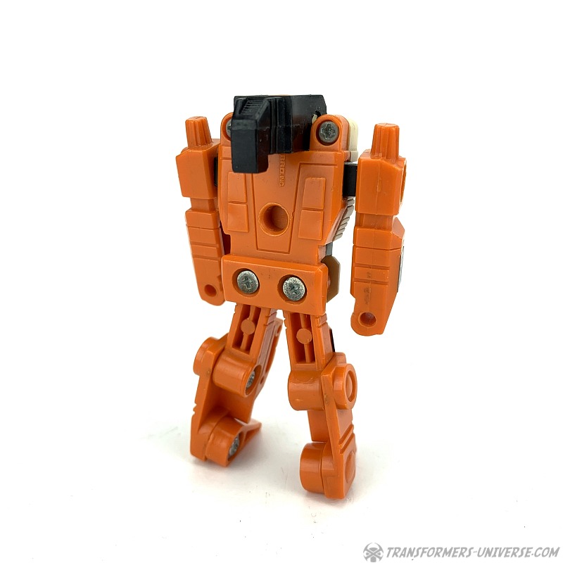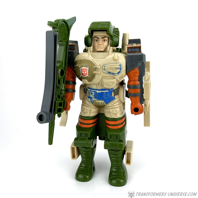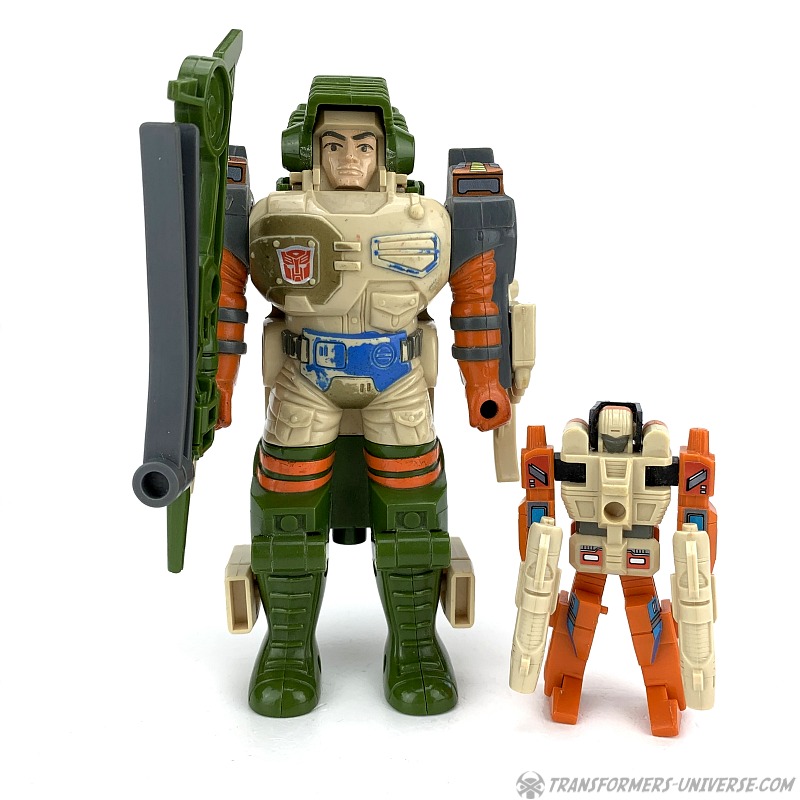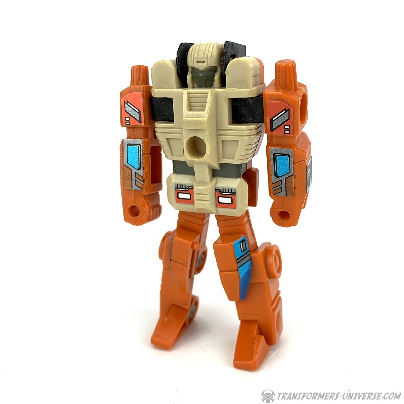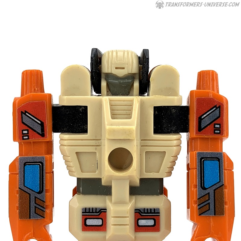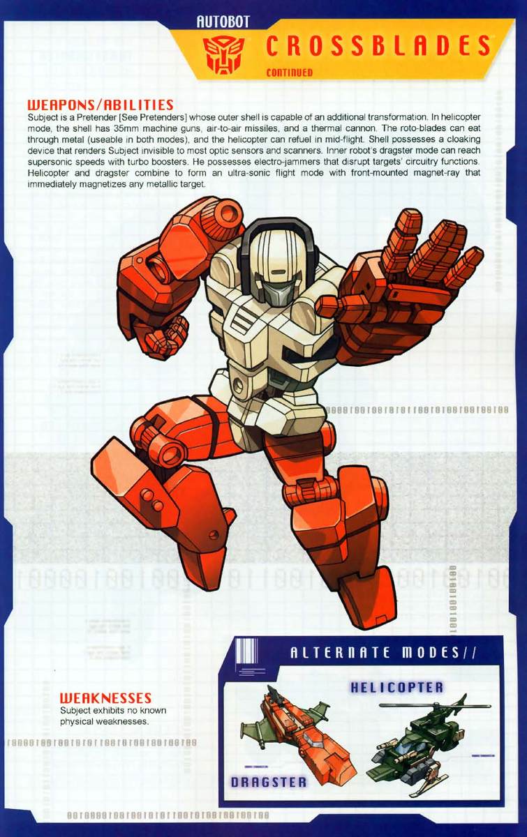 A hyperactive, overheated sky jockey. Talks constantly. Patrols Autobot headquarter perimeters with lightning speed, searching for Decepticon infiltrators. Only stops long enough to refuel and check his weapons. Armed with automatic 35mm machine guns, air-to-air missiles, and a searing thermal cannon. Also equipped with mid-flight refueling capabilities and cloaking device that makes him invisible. Transforms to supersonic dragster, equipped with high-speed turbo boosters and electro-jammers that disrupt enemy circuitry. Outer shell chopper equipped with metal-eating roto-blades. Combines with dragster to form ultra-sonic helicopter equipped with front-mounted magneto-ray that magnetizes on impact.