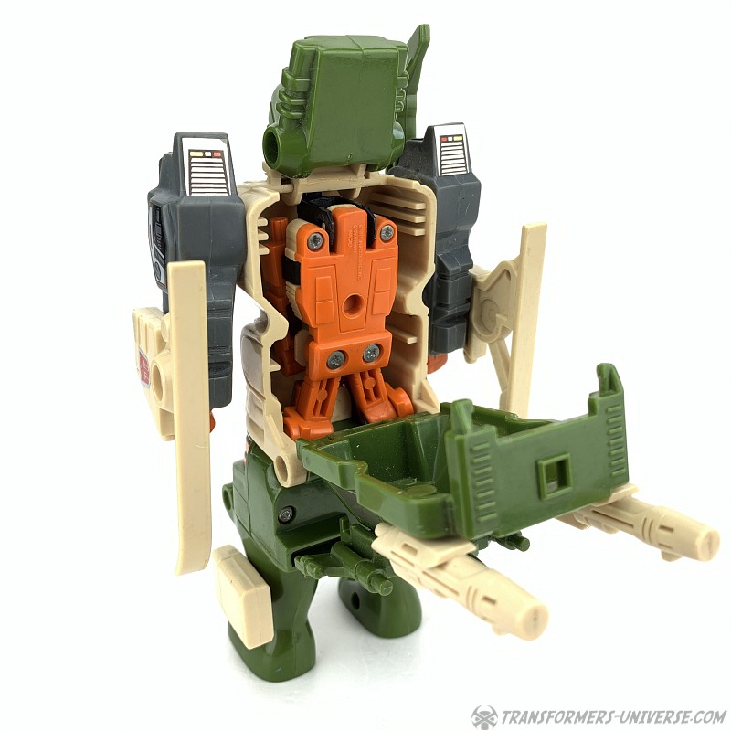 Inner Robot: The actual Crossblades robot is a small orange and beige figure. Due to the constraints of the Pretender gimmick he is pretty slim and his transformation is pretty basic, too. His articulation is restricted to the arms, which can move at the shoulders, and he can spread his legs a bit, that’s it. Not bad for the time, but not particularly great, either. Crossblades wields two big guns for weapons.