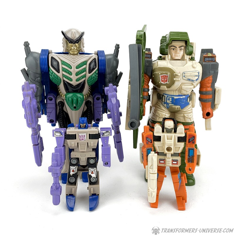 Remarks: It was the year 1989 and while the world celebrated the end of the cold war, gimmicks were taking over the Transformers toy line. Every single toy released by Hasbro that year was either a Micromaster or a Pretender. And the Pretenders were getting crazier, too. Apart from the “normal” Pretenders and Pretender Classics, you had the Beast Pretenders, Pretender Monsters, Vehicle Pretenders, Ultra Pretenders, and, in case of Crossblades, Mega Pretenders. One of them, Thunderwing, made it big in the comics, but neither Crossblades nor his gimmick-mate Vroom ever achieved more than a few background appearances in some comics. Crossblades was repainted into Blue Bacchus for the Takara release, though, and at least scored an appearance in the Victory TV series there.