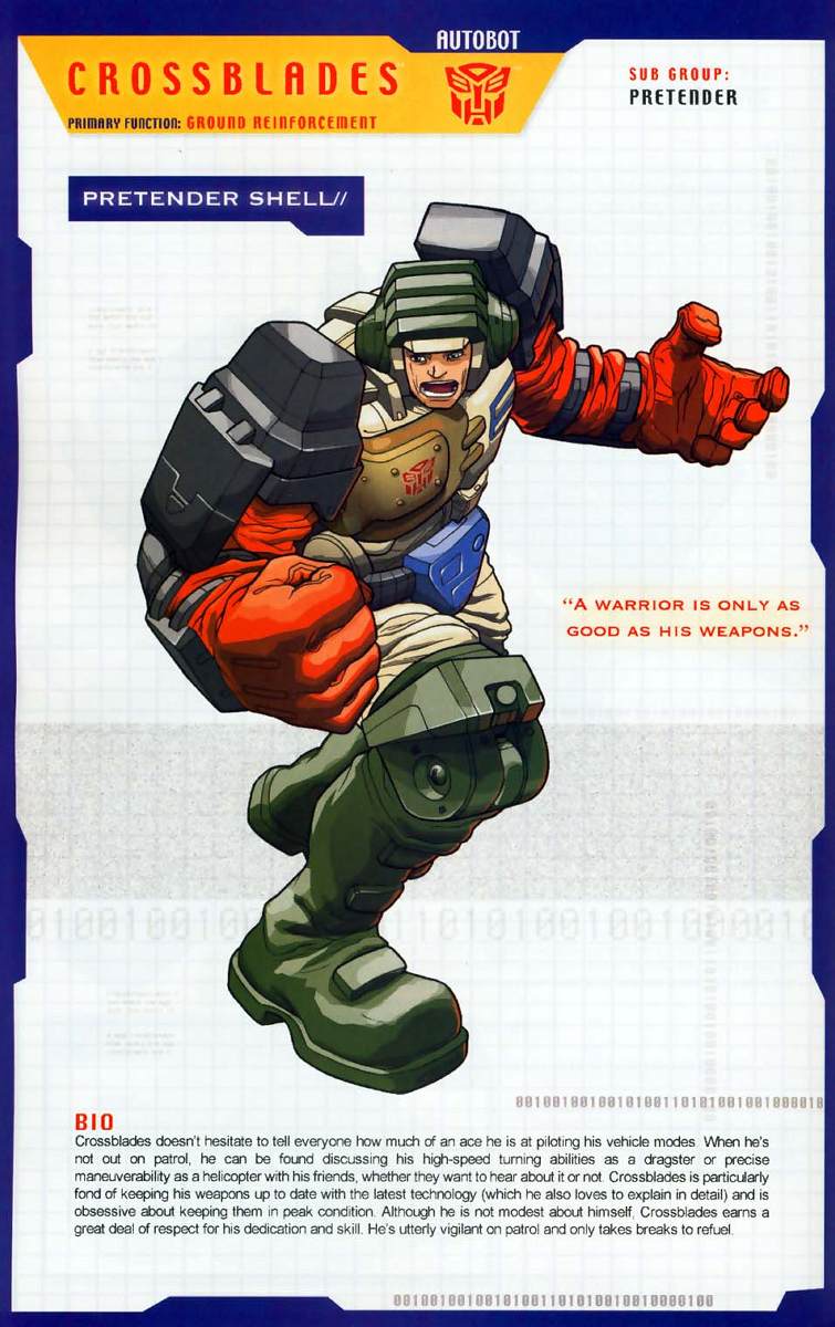 Pretender Shell: Crossblade’s Pretender shell resembles a kind of space marine, wearing futuristic combat gear. I like that they sculpted parts of the figure so that it looks like he’s wearing a fabric uniform underneath, very nicely done. There is a lot of kibble attached to the shell, though, and it is wearing quite the backpack, too. Like with all Pretenders movement is restricted to turning the arms at the shoulders. For weapons he carries the rear assembly of his helicopter mode as a rifle, as well as the wing piece from his robot’s vehicle mode. Overall he doesn’t look too bad, but the sheer amount of kibble does drag him down a bit.