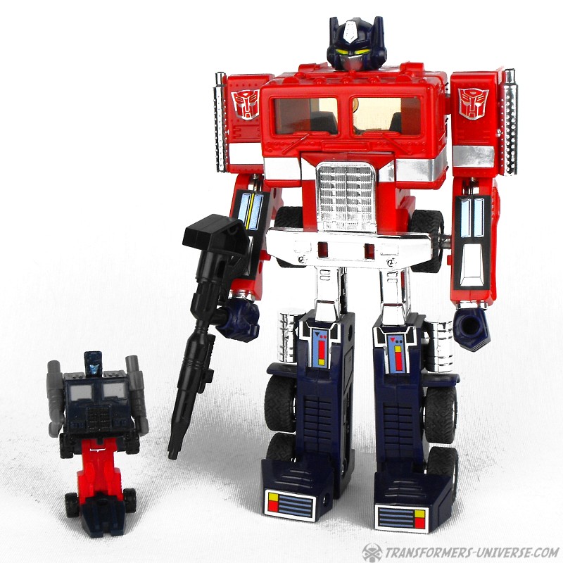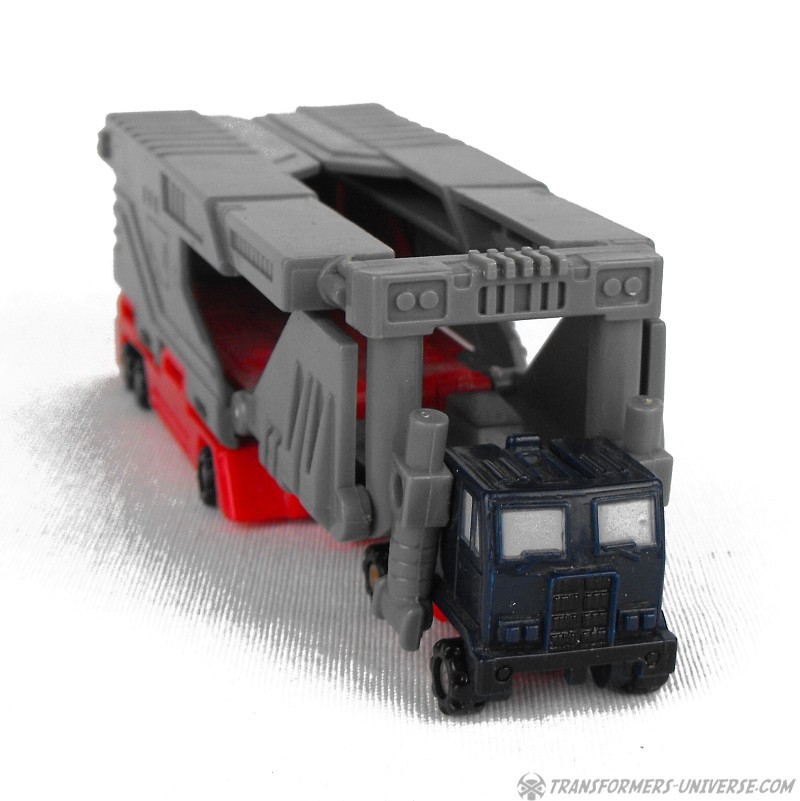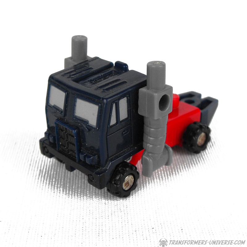 Robot Mode: Overload in robot mode is somewhat reminiscient of Optimus Prime, but only somewhat. The boxy torse is the truck cap, the arms are smokestacks, and the rear of the truck becomes the legs. Detailing, posability, variety of colour, forget about it! As a Micromaster he doesn't have any of that.