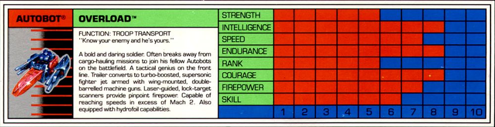 A bold and daring soldier. Often breaks away from cargo-hauling missions to join his fellow Autobots on the battlefield. A tactical genius on the front line. Trailer converts to turbo-boosted, supersonic fighter jet armed with wing-mounted, double-barrelled machine guns. Laser-guided, lock-target scanners provide pinpoint firepower. Capable of reaching speeds in excess of Mach 2. Also equipped with hydrofoil capabilities.
