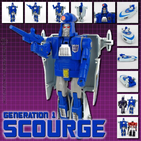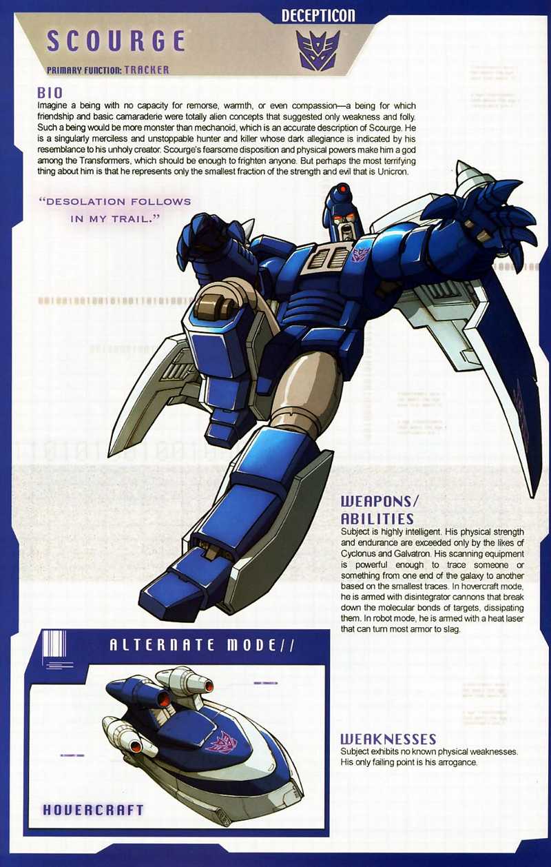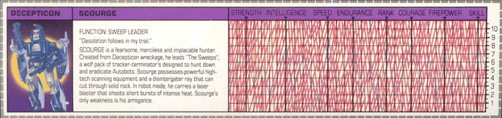 Scourge is fearsome, merciless and implacable hunter. Created from Decepticon wreckage, he leads "The Sweeps", a wolf pack of tracker-terminator's designed to hunt down and eradicate Autobots. Scourge possesses powerful high-tech scanning equipment and a disintergater ray that can cut through solid rock. In robot Mode, he carries a laser blaster that shoots short bursts of intense heat. Scourge's only weakness is his arrogance..