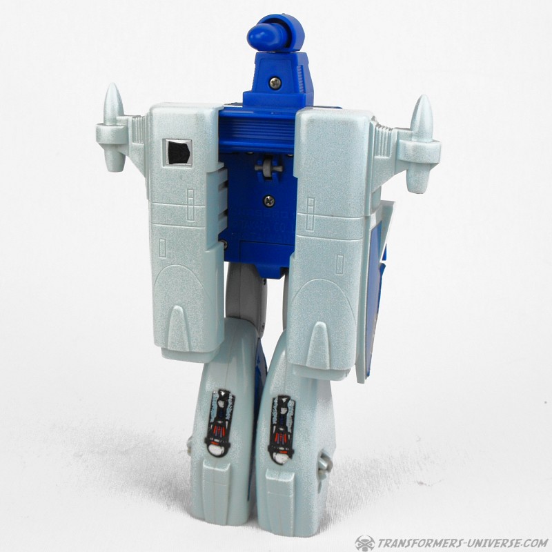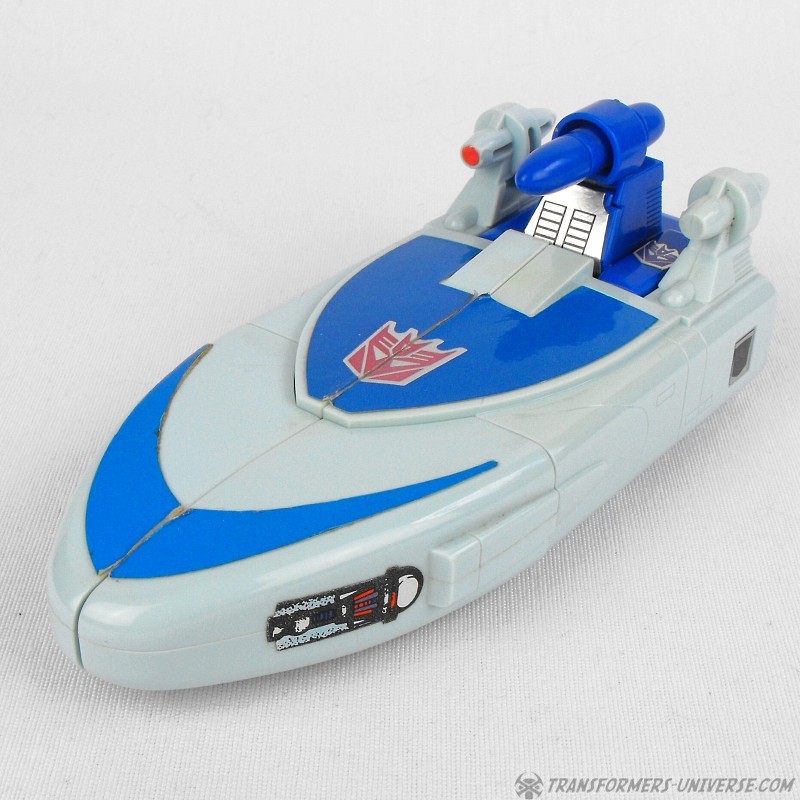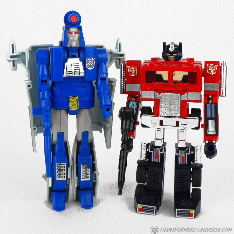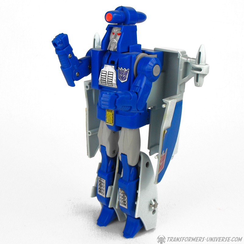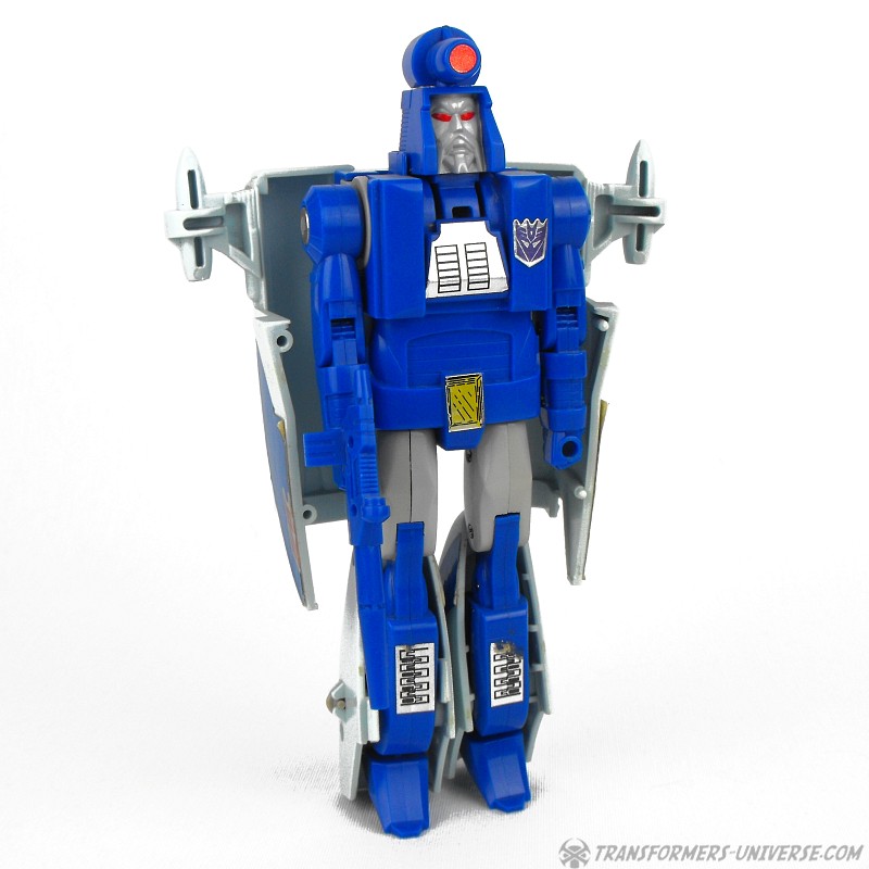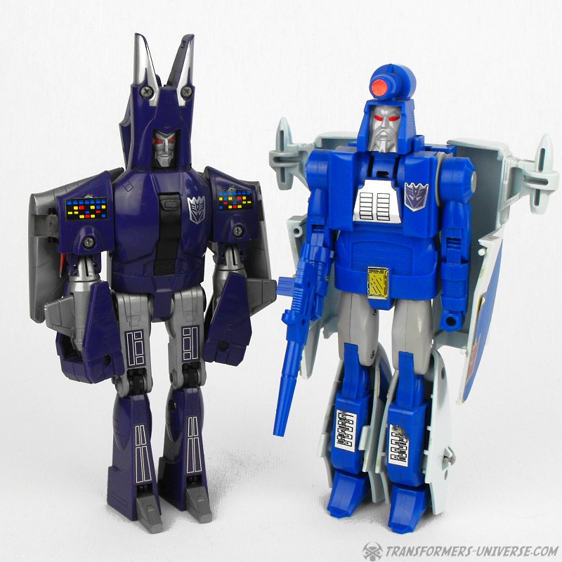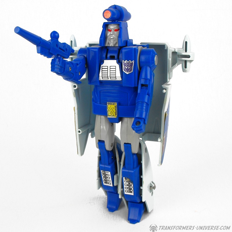 Remarks: Scourge was created by Unicron from the remains of one of the G1 Seekers, either Skywarp or Thundercracker (start your discussion here). He didn't play a large part in the movie, but was of the main bad guys in the third season of the cartoon, mostly paired with fellow Unicronian Cyclonus. He could also replicate a seemingly endless number of Sweeps as his army. The Sweeps were the redshirts of the Decepticons, getting shot, crushed, and maimed with frightening regularity. Fun guys.