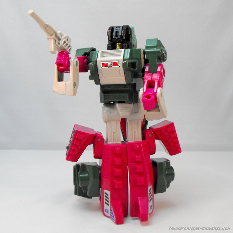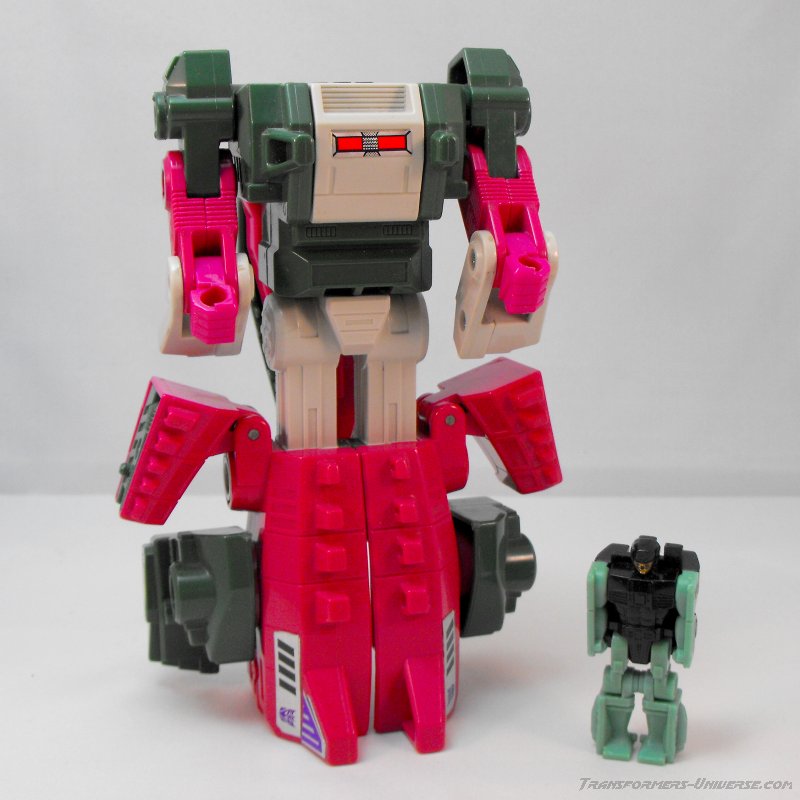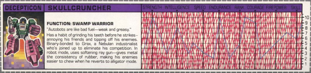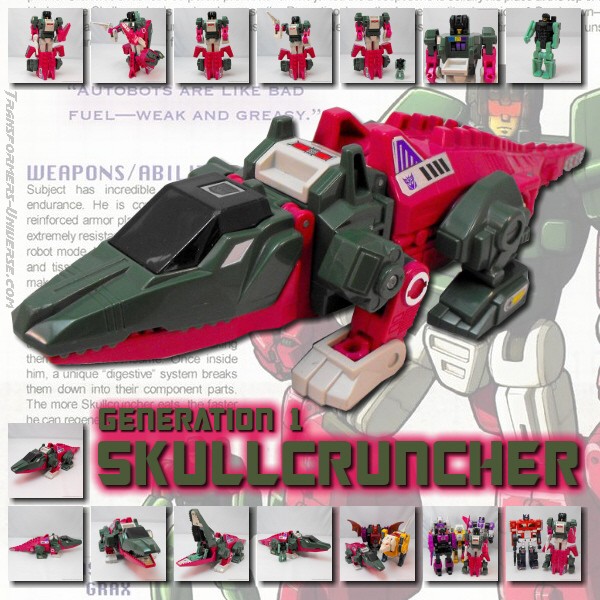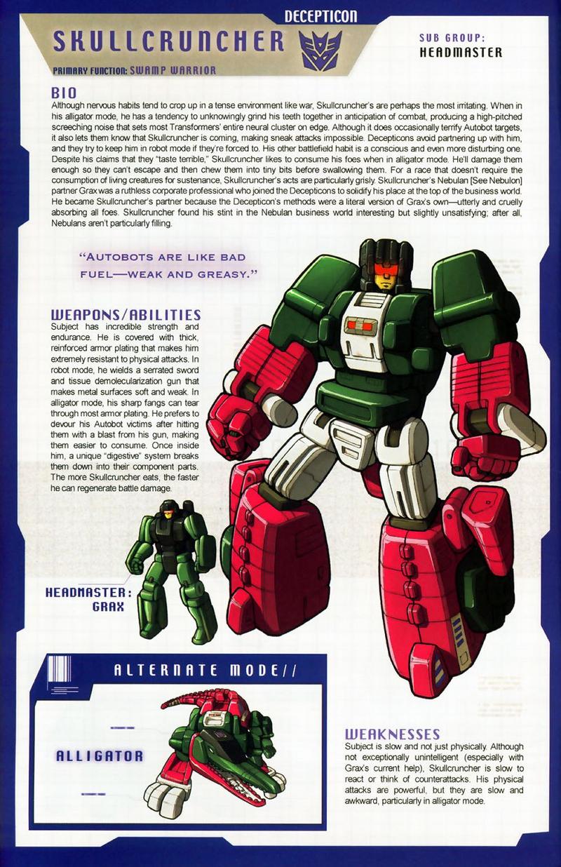 Remarks: To the western world Skullcruncher was just one more new face in the crowd during the infamous three-part finale of the G1 cartoon, "Rebirth". He did nothing of consequence there and his role in the Marvel comic series wasn't any bigger, either. Just one of the crowd. In the Japanese Headmaster series, though, he had a bigger role as one of the trio of Destron Headmasters that took point in just about every battle of that series and blew up planet Seibertron (the Japanese name for Cybertron), too. That will look impressive on just about any résumé.