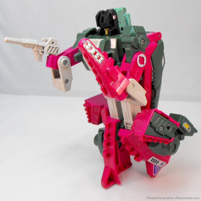 Robot Mode: Skullcruncher is a tall, relatively slim robot who would probably be part of the Deluxe-class if he were released today. There are very few parts of his alternate mode visible, at least from the front. The head of the alligator hangs on his back and the tail is split and hangs off his knees right above the rear legs of the alligator, which hang off his thighs. Nothing that gets in the way, there are TFs with much, much worse kibble. The paint job with green and something that is somewhere between purple and burgundy looks good, almost understated. Might have looked better without the purple/burgundy, though. Not sure and definitely not sacrificing this one for a repaint.