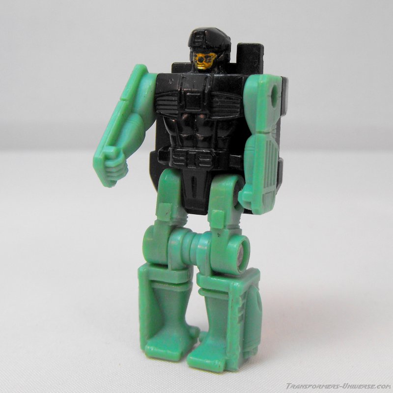 Partner / Add-On: As a Headmaster Skullcruncher's head is a separate figure, the Nebulon Grax. Mostly black, Grax is a pretty standard Headmaster figure from the gimmick's first year. Far more posable than later Headmaster figure, he can move his legs quite freely (though they're joined at the knees) and his arms swivel at the shoulders. Pretty decent for his size. When plugged into Skullcruncher in head mode, he causes the robot's stats to become visible behind his chest panel.