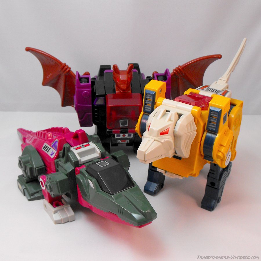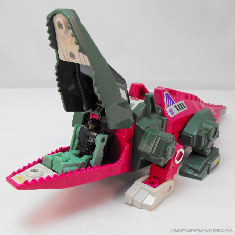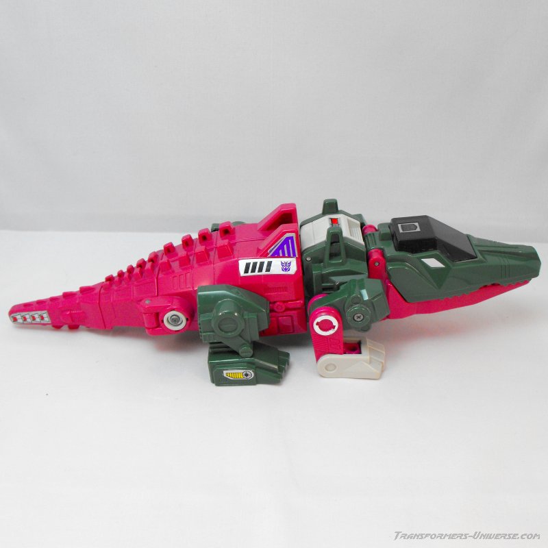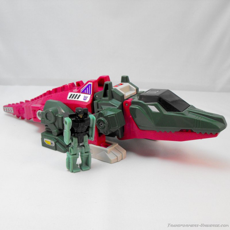 The color combination is the same here as in robot mode. Wouldn't have been my first choice, but looks okay. The alligator's head doubles as a cockpit for Headmaster Grax, who has to enter his partner's mouth in order to take a seat (would make me very nervous each time). Posability in the four legs is okay, the front ones (the robot arms) do better than the rear ones, which can only swivel at the 'hip', so to speak. No tail movement, sadly, and the twisting hip doesn't do much good here, either. Skullcruncher can open his jaw wide enough, though, to swallow small figures and fully grab taller ones (if Grax isn't in the seat, at least). So all in all a beast mode more for looking at than playing with, but still quite good.