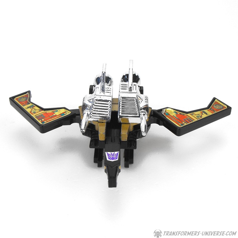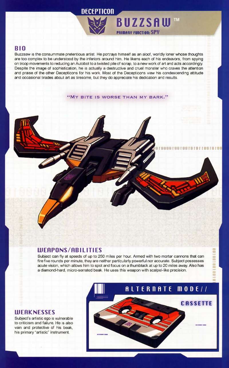 Partners / Add-Ons: Soundwave comes with the Buzzsaw Cassette figure. Buzzsaw transforms from cassette to robotic condor, complete with two big guns on his back.