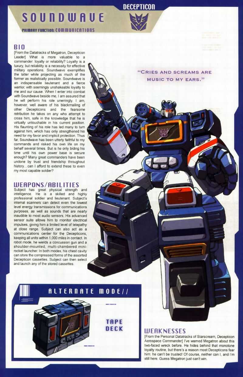 It is said Soundwave can hear a fly sneeze. Uses anything he hears for blackmail to advance his status. Opportunist. Despised by all other Decepticons. Sensors can detect even lowest energy radio transmissions. Able to read minds by monitoring electrical brain impulses. Acts as radio link for others. Locates and identifies Autobots, then informs Decepticons. Carries a concussion blaster gun. Often target of retaliation by his comrades.