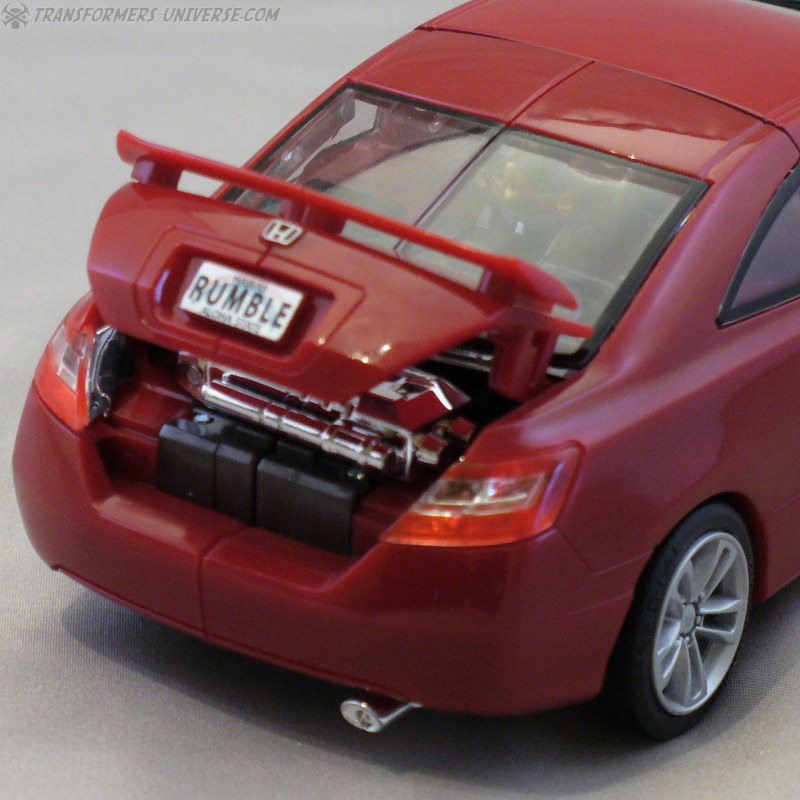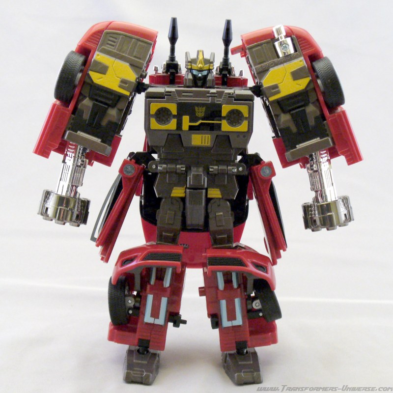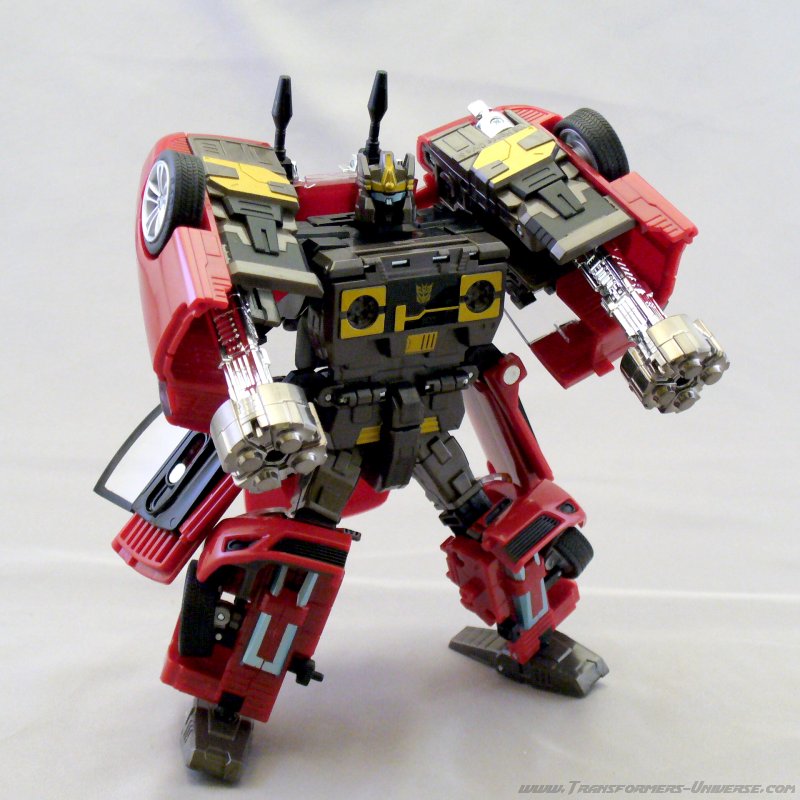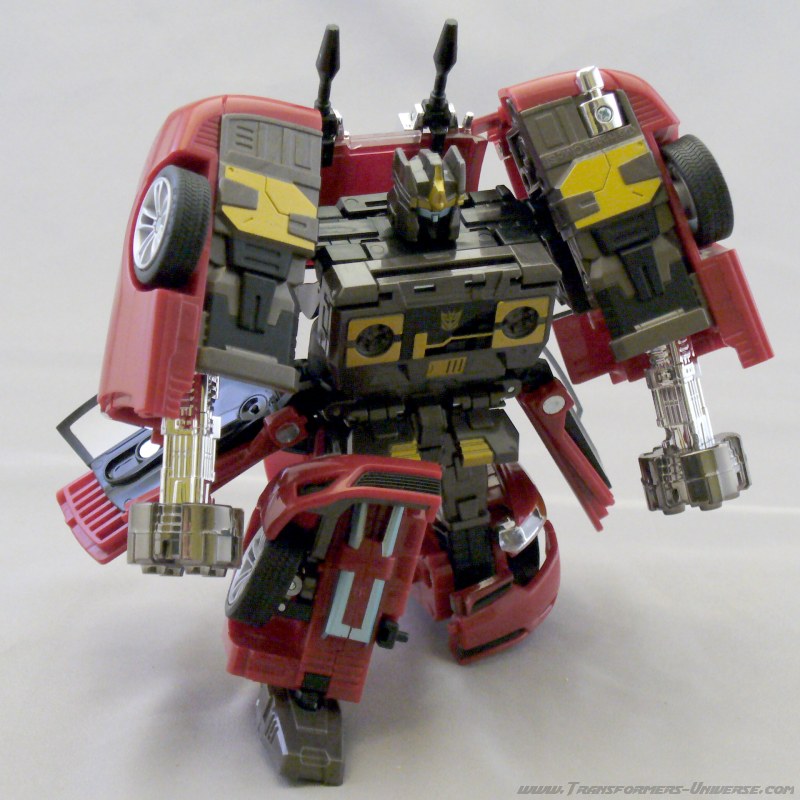 Remarks: Let's not get into the whole thing of whether Rumble is the blue or the red one. In the Alternators line, he definitely IS the red one. Rumble, along with Ravage, came out in the final wave of Alternators toys in the US. Those two are also the only Decepticon Alternators with molds that weren't used for Autobots first. Rumble is also the only Alternator toy with a spring-loaded gimmick, his piledriver arms. Of course he sacrificed his hands for it. Rumble was never released in Binaltech or any of its follow-ups, so it's exclusively an Alternators toy.