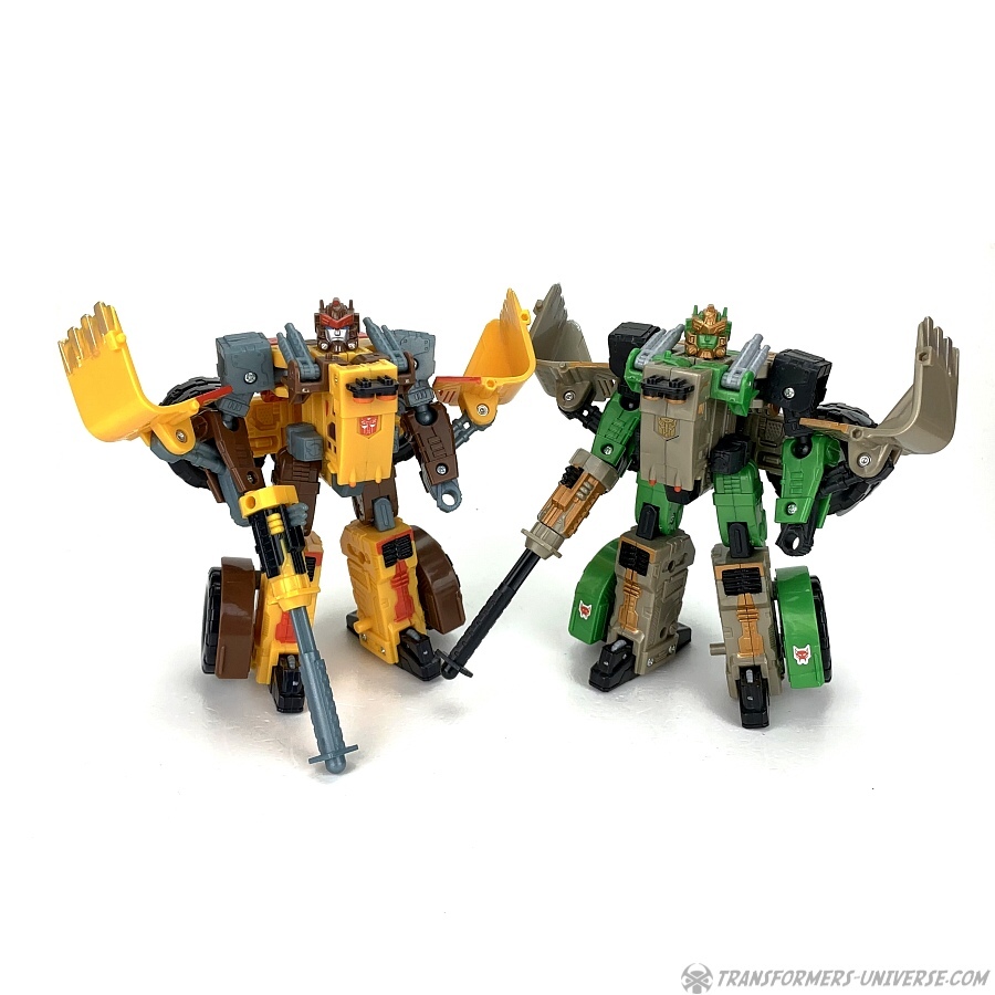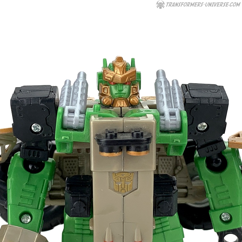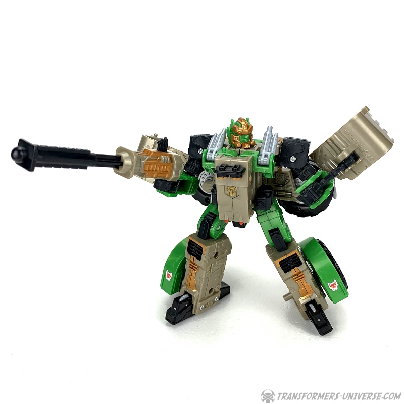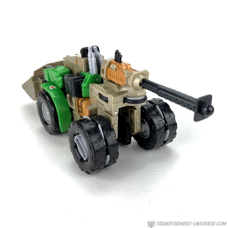 There were no tooling changes to the Landmine figure, so only the paintjob is different and consists of mostly green and beige parts, which fits with the original toy and more or less fits with Rhinox’ coloring in the TV show. The head is still that of Landmine, just repainted to look a bit more like Rhinox. I’d call it a partial success. If you don’t look too closely, there is some resemblance to Rhinox.