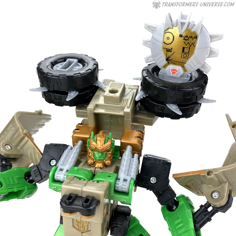 As a repaint of a Cybertron figure, Rhinox comes with a Cyberkey, of course (patterned after Beast Wars’ Golden Disc), which activates a gimmick. The two big wheels from his back flip up behind his head, extend blades, and twirl around. In the Galaxy Force cartoon this gimmick was called “Tornado Cutter” and it does somewhat resemble Rhinox’ famous Chain Guns of Doom. Not perfectly, but enough to establish a connection.