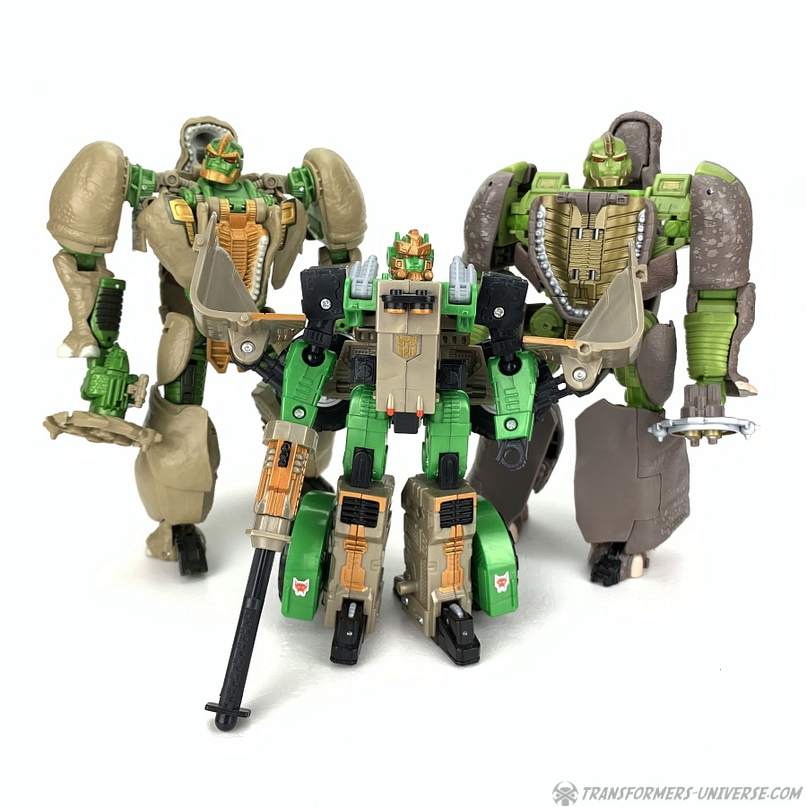 Rhinox is a Deluxe-class figure, which would have been my first complaint, seeing as Rhinox was always a pretty big guy and should at least be Voyager-Class. Then I reminded myself, though, that the original Beast Wars Rhinox figure was also a Deluxe (and a smaller one at that), so I guess we cannot fault the FunPub guys for choosing a Deluxe for their Botcon set after all. This was years before the first Voyager-Class Rhinox.