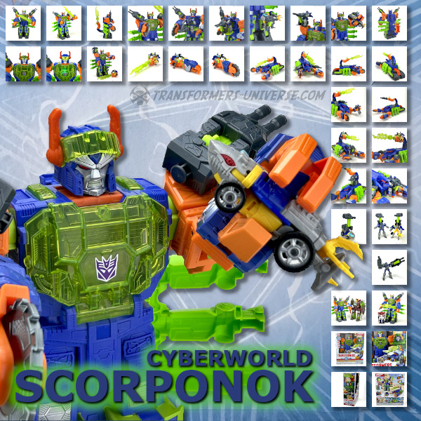 Robot Mode: Let us start by saying that Cyberworld Scorponok is (so far, at least) the biggest figure released in the Cyberworld line and he easily towers over all the other figures released. In fact his claw hand seems custom-made to grab any of the smaller figures, be it in robot or alternate mode, and lift them up to face their doom. Like most of the figures in the line his design somewhat mirrors the later-day Generation 1 design in terms of blockiness and bright colors.