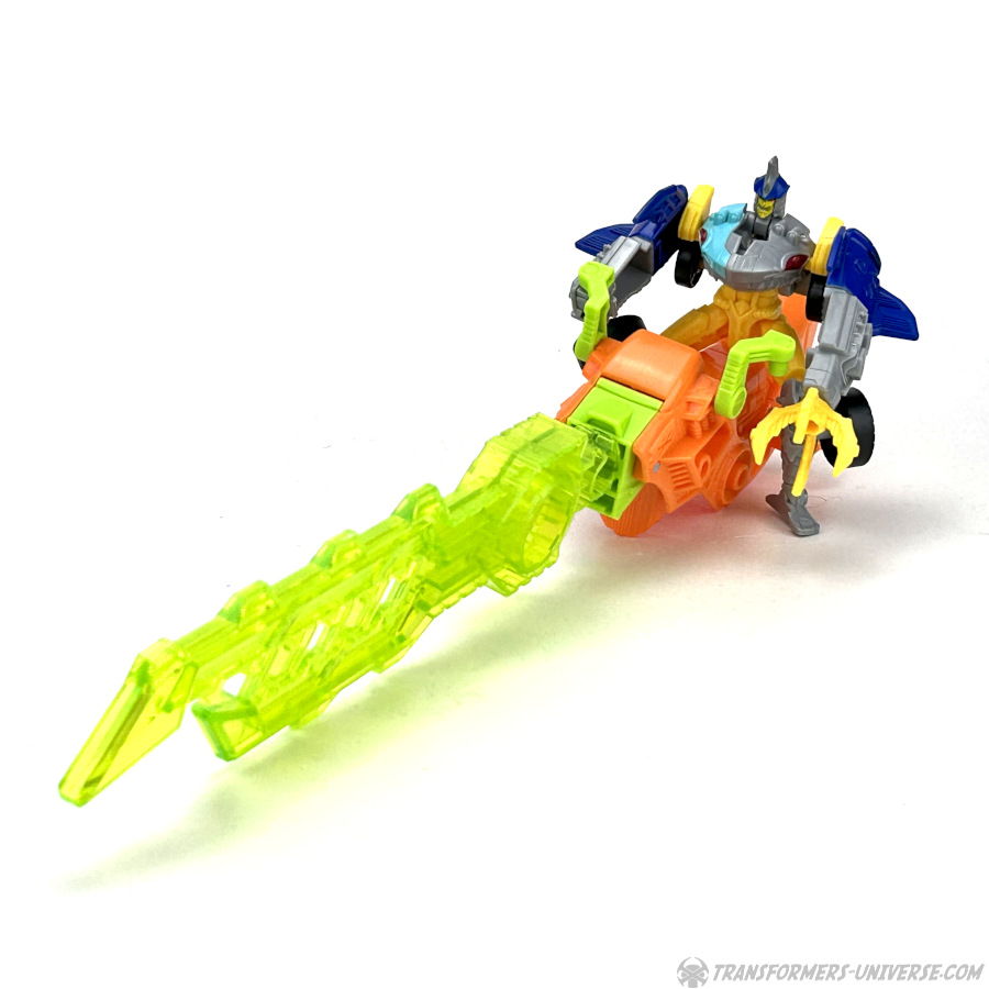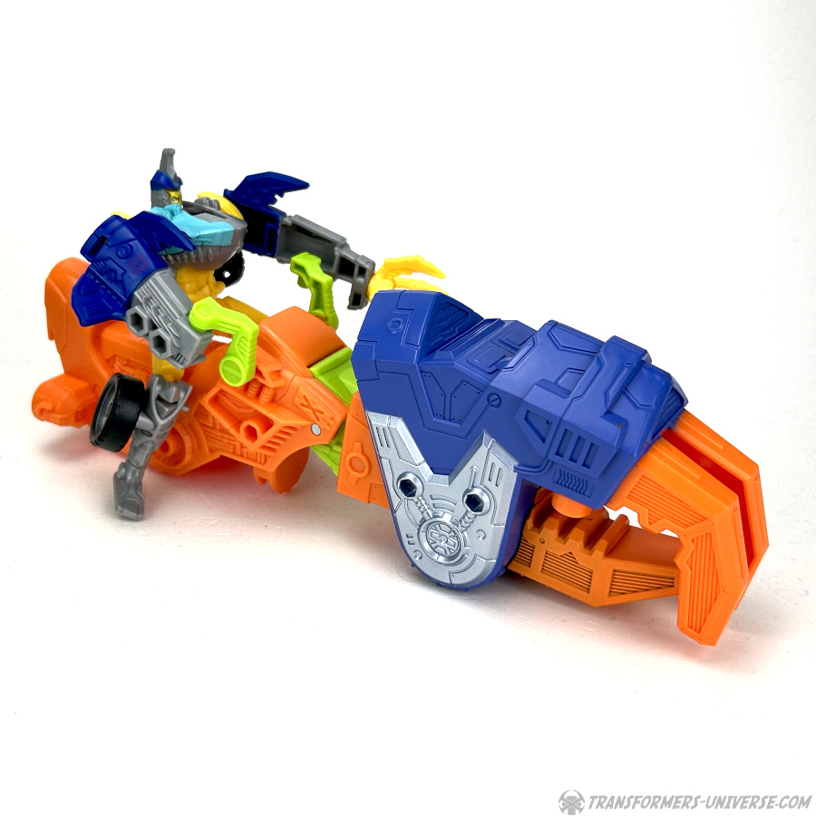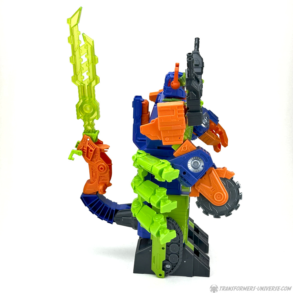 Also, the middle part of the tail is an extra detachable part that becomes a motorcycle. Well, half of a motorcycle, really, as you need to attach either the claw, the saw, or the sword to it to serve as the front half. It’s totally weird and bonkers and I love it. Reminds me of the weird laser cycle included with Beast Wars 2 Tako Tank, another weird and bonkers toy. You can also attach one of the turrets to the front of the bike, mind you, but that doesn’t really work well as the bike tips forward.