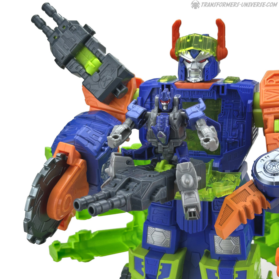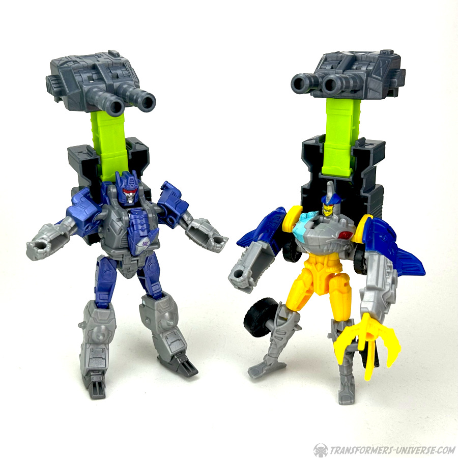You quickly notice that Cyberworld Scorp is not designed as a big collectors figure, but as a fun toy for kids. Articulation is restricted to the arms, the rest of him is pretty much immobile. Which is okay, as he is mostly there as a playset for the smaller figures. I already mentioned the claw and his other arms ends in a big circular saw. He has a tail that ends in a pretty big sword, which he can detach and wield with his claw. He also comes with two double-barreled shoulder turrets, which can also detach and you can use one of them as an alternate “stinger” for the tail. Said tail could use an extra joint or two to not stand out quite so awkwardly on the robot’s back, but again, it’s a kid’s toy.