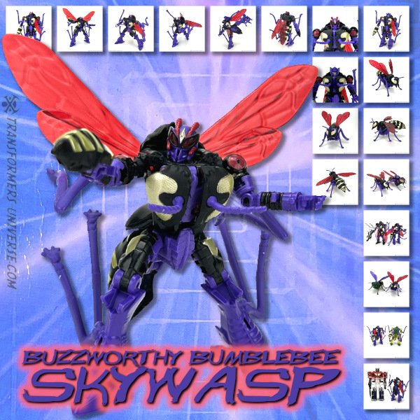 Prelude: May we assume that, in some alternate universe or other, poor Waspinator got possessed by a different Seeker’s ghost? Not Starscream, but Skywarp? If so, that would explain this repaint here, Waspinator all dressed up in Skywarp’s colors. Or maybe Skywarp survived and was reformatted for Beast Wars? We may never know, but here we have Buzzworthy Bumblebee Skywasp. Let’s go!