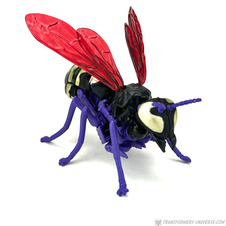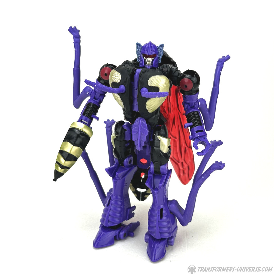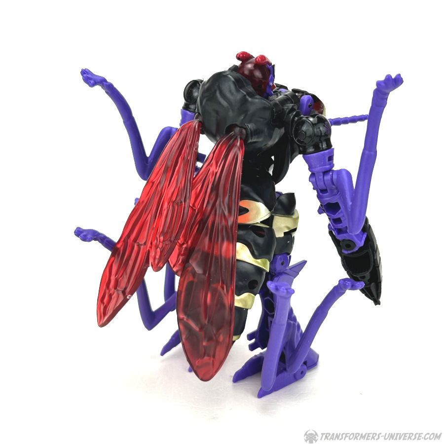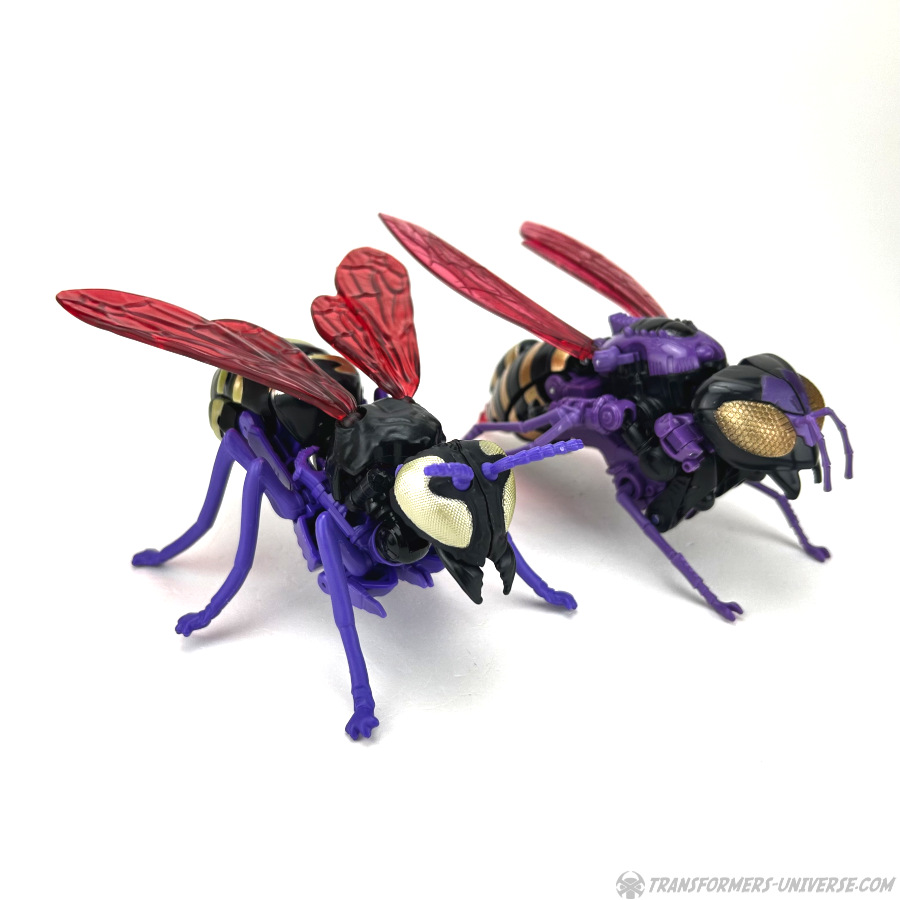 Skywasp is a straight-up repaint, but comes with an additional head you can switch out for the standard Waspinator noggin’. The head is based on the non-Mutant head of the original Beast Wars Waspinator figure (the one used for Buzzsaw), just in purple instead of green.