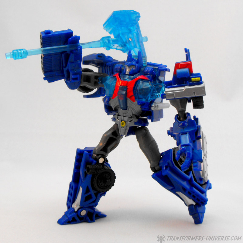 Like his Animated predecessor Magnus carries a big hammer as his main weapon. He can wield the weapon two-handed, but that requires quite a bit of rather unnatural-looking arm positioning, so I advise against it. The hammer can convert into a big rifle, which he can either hold on hand or mount on his forearm. Either way, a weapon befitting Ultra Magnus. Overall, nothing to complain about here, a superb Commander-class figure in robot mode.