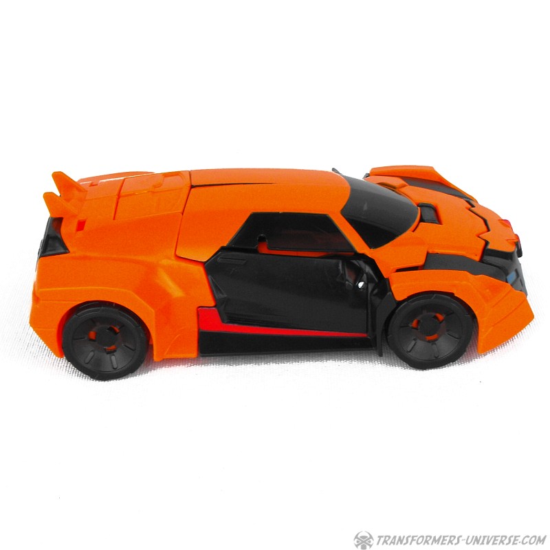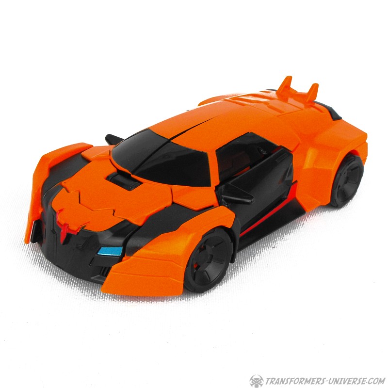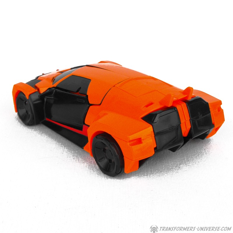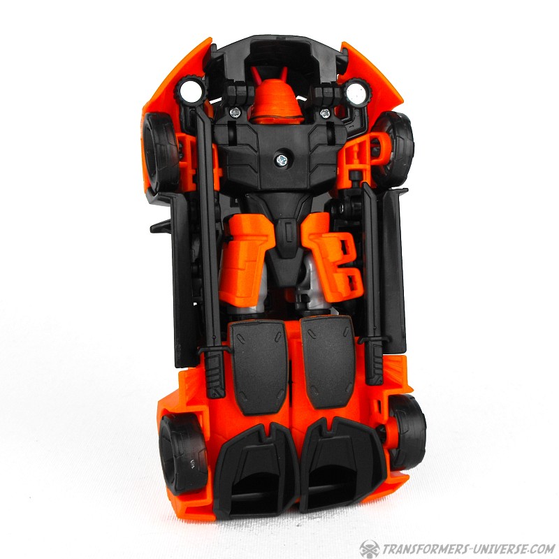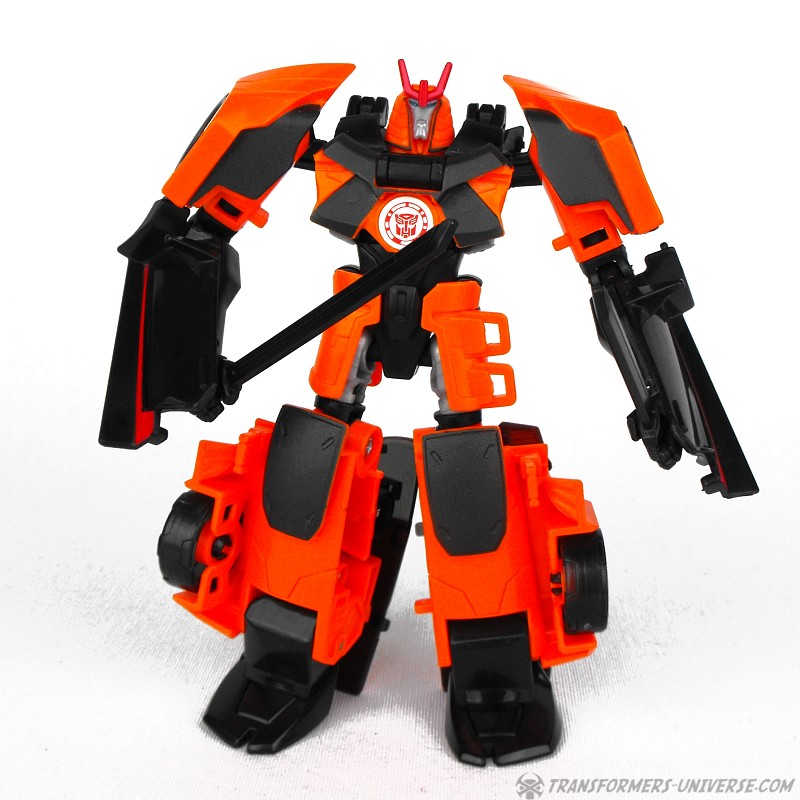 Robot Mode: Drift has gone through several different color schemes by now. The first Drift (from the IDW comics) was white. Then followed the Age of Extinction Drift, who was blue. And now we have a Drift in Robots in Disguise 2.0, who is orange. What hasn’t changed, though, is that he is a Samurai-type guy with the traditional two swords and a strong Japanese influence on his design. Much like his Age of Extinction forebear he has a head resembling a medieval Samurai helmet and his face includes a sculpted (but sadly not painted) beard in Japanese styling as well. His robot mode feet are formed to resemble Tabi, those Japanese socks with the separated big toe. And finally he has a kind of armored skirt around his hip, too, completing his Samurai look.