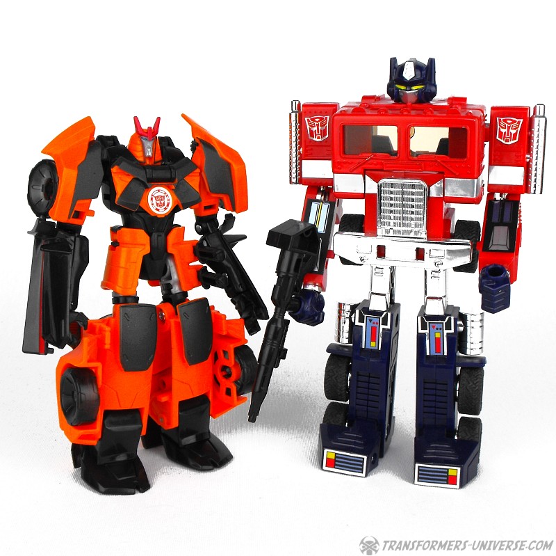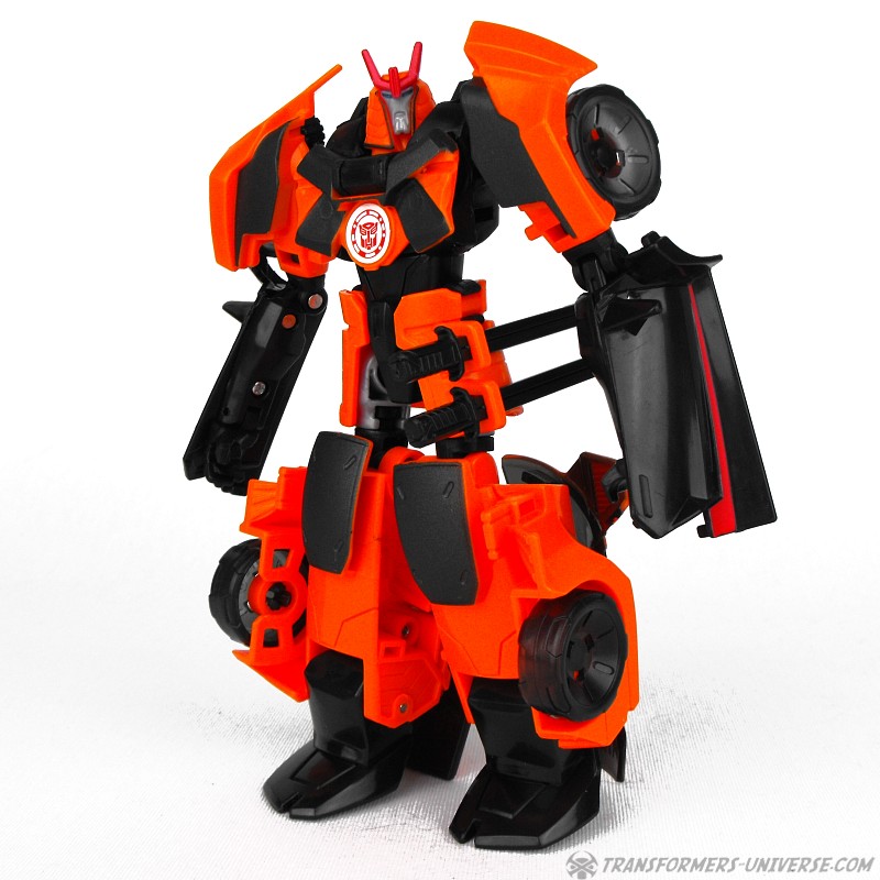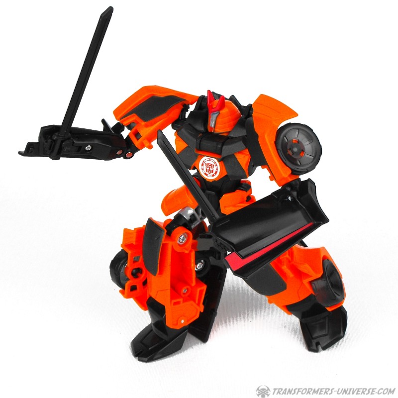 Drift’s proportions are a bit strange, as he has huge lower legs, feet and shoulders, while his torso and head are relatively tiny. It works, though, especially with the more stylized approach of the new RID series. No complaints about the articulation, Drift can pose with the best of them. He lacks twisting wrists, which I always prefer on a sword-wielding bot, but he makes up for it with double elbow-joints, so he can pull off a few sword-slashing poses without problem. When he needs his hands free, he can sheathe his swords at his left hip (not mentioned in the instructions).