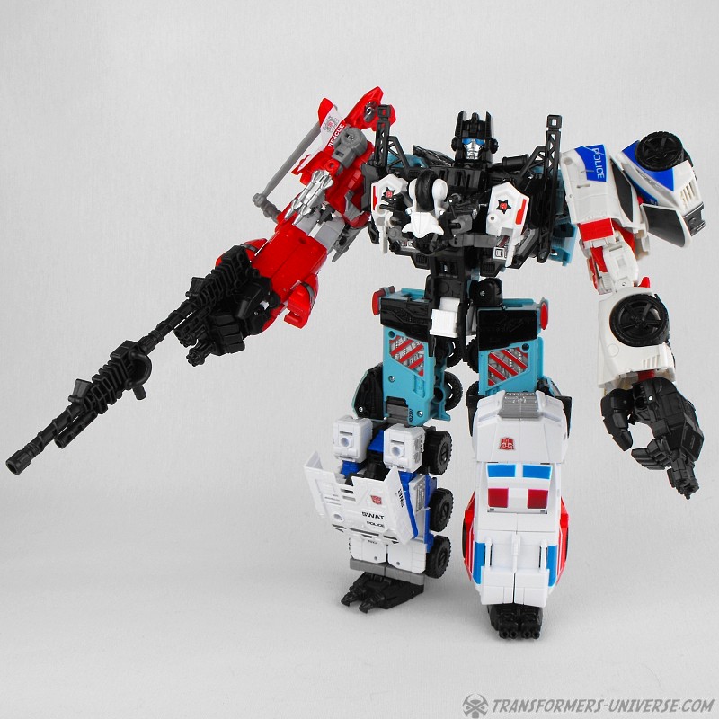 Once combined, Defensor is, in my mind, one of the most playable combiners ever. He’s not nearly as fragile as other combiners have been (both in G1 and later), there is very little danger of parts or limbs just falling off, he’s fully articulated, and the proportions work fine as well. Sure, he’s not as huge and detailed as TFC Ares, for example, but he’s better balanced, more stable, and will actually survive a kid playing with him.