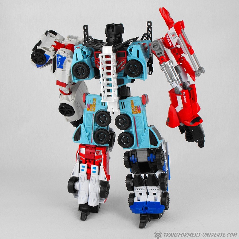 Combined Mode: Hot Spot as the leader forms the torso of the combiner. Basically the figure just turns around, folds its head in, and wraps the ladder with the Defensor head at its end once around its entire body. The base of the ladder expands into the chest piece and the head is plugged in on top. The four Deluxe-sized Protectobots become the arms and legs, each of them capable of being either. I have no particular preference here except that I think Blades looks better as an arm than a leg, the other three work well as either. Finally, Groove plugs into Defensor’s otherwise pretty boring looking chest as an additional chest plate. You wouldn’t think that it would make much of a difference, but it really does, so let me put this out there right here: if you want to assemble Defensor, please get Groove as well. He’s not strictly necessary, but Defensor looks so much better with him.