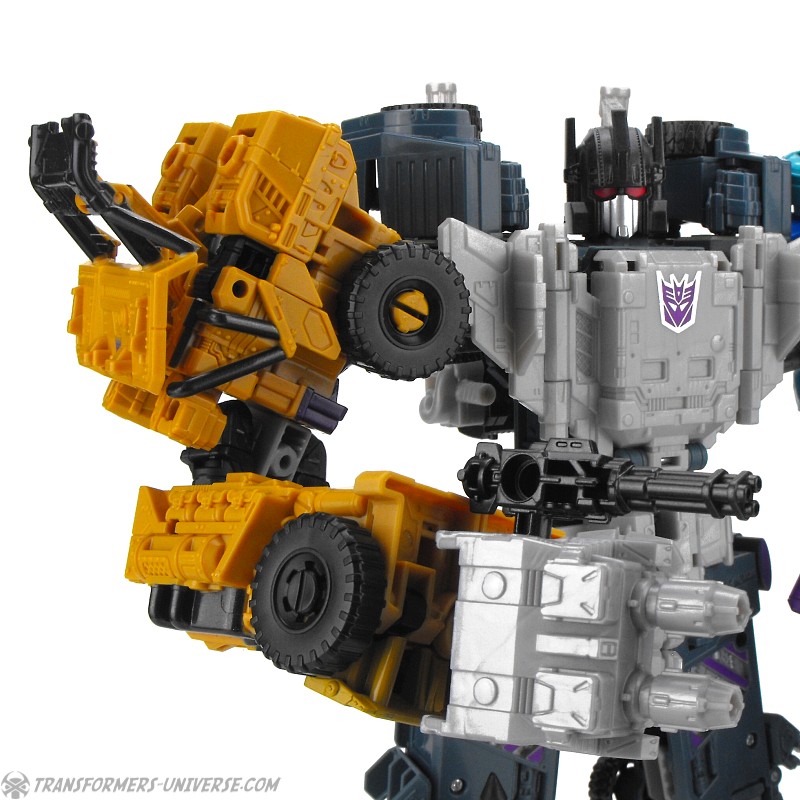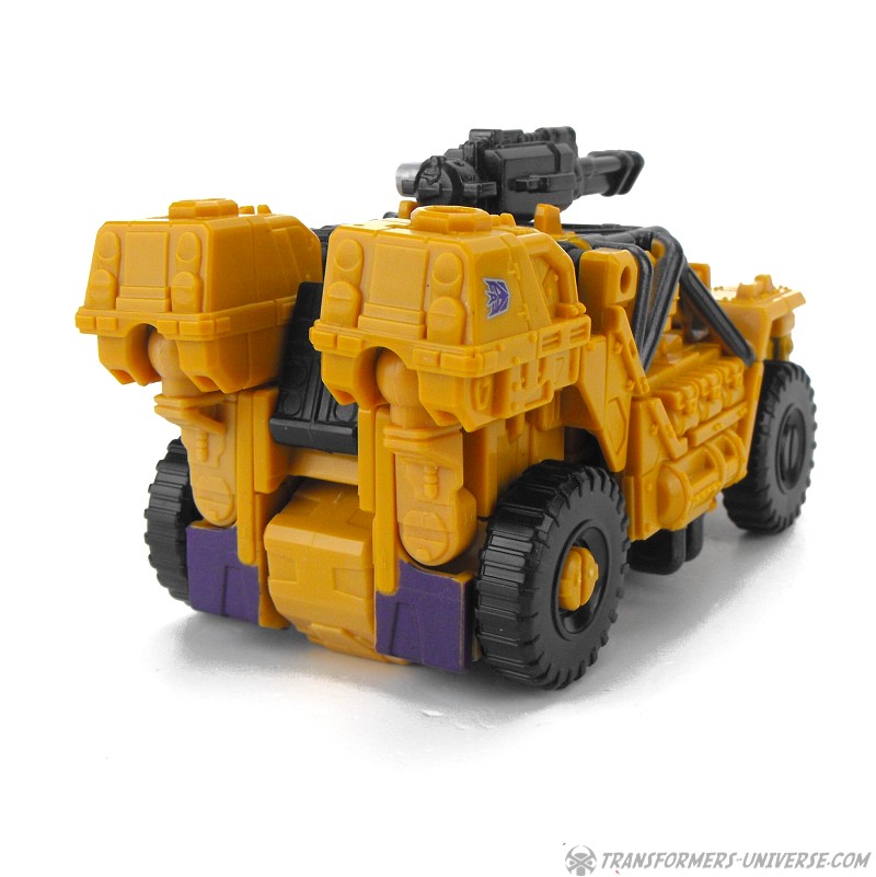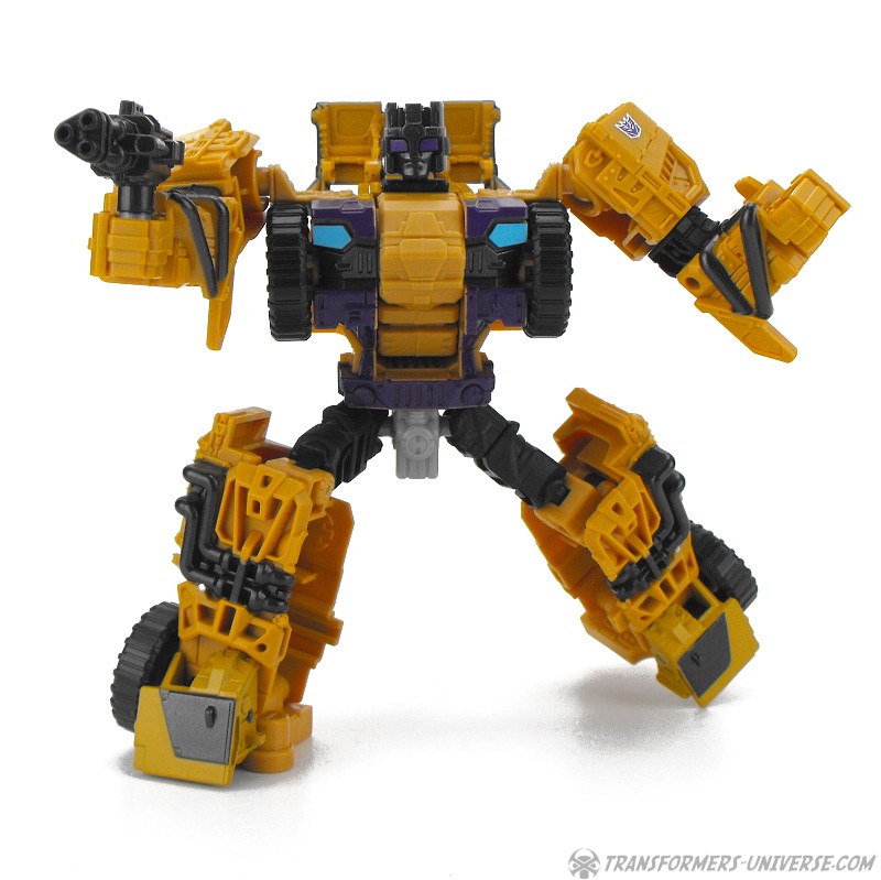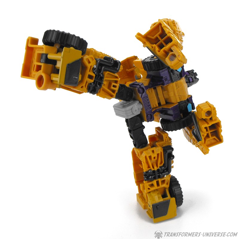 Articulation is standard for a Combiner Wars figure, meaning pretty good, and Swindle can do quite a few cool poses. No twisting wrists or ankle tilt, but that wasn’t really standard yet at the time. He comes with black minigun as a weapon, as well as the usual combiner foot/fist/gun thing.
