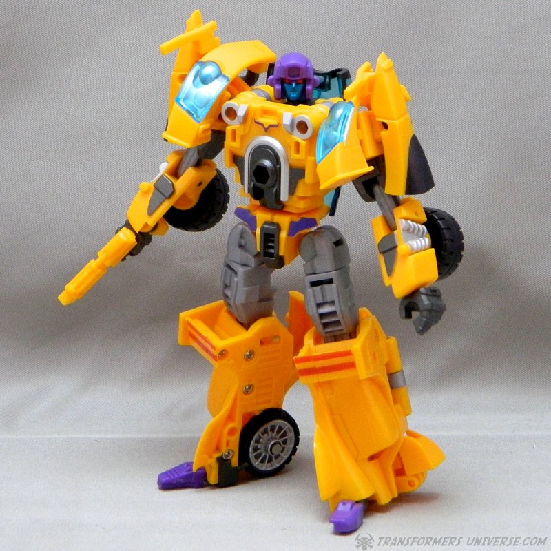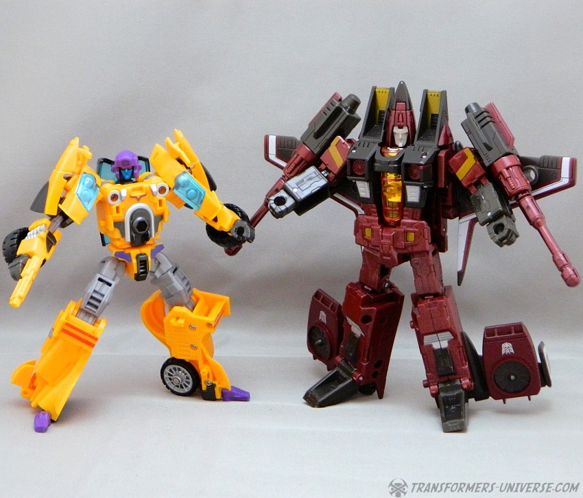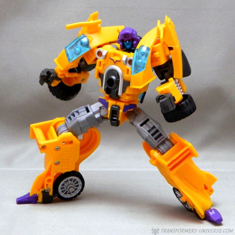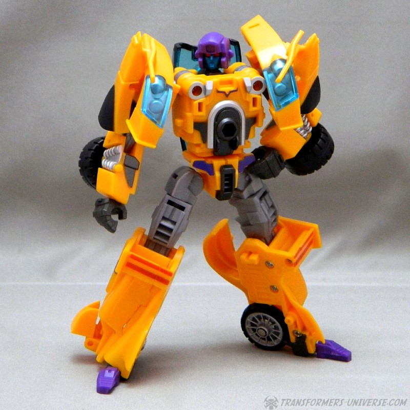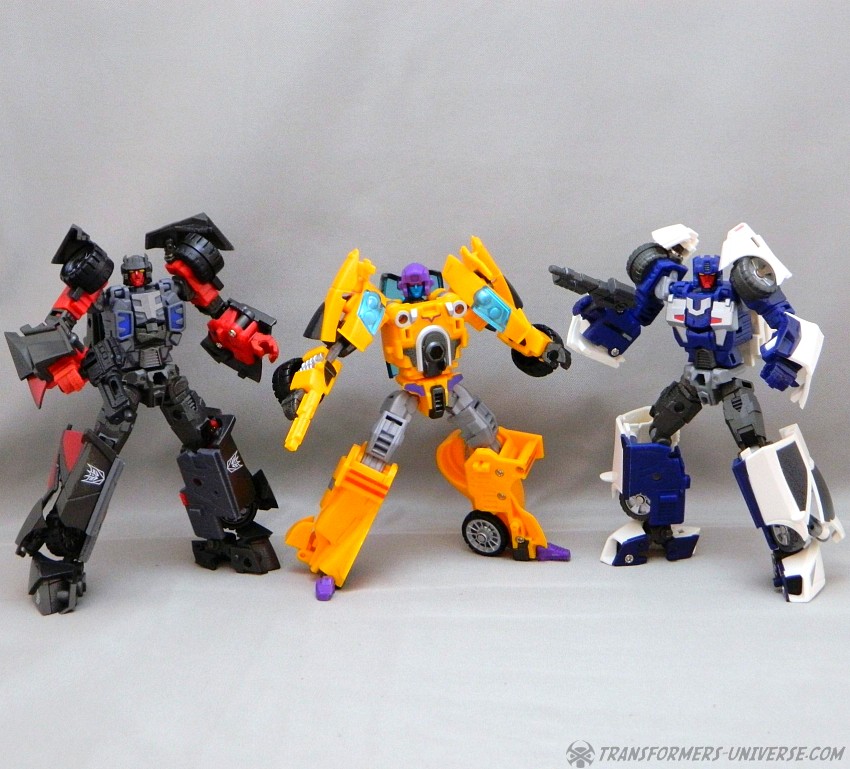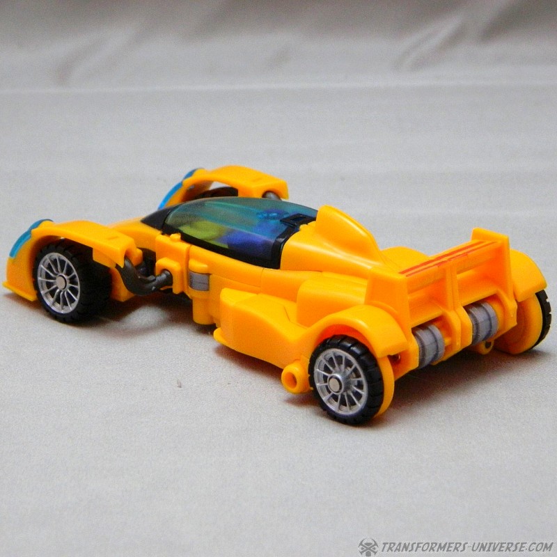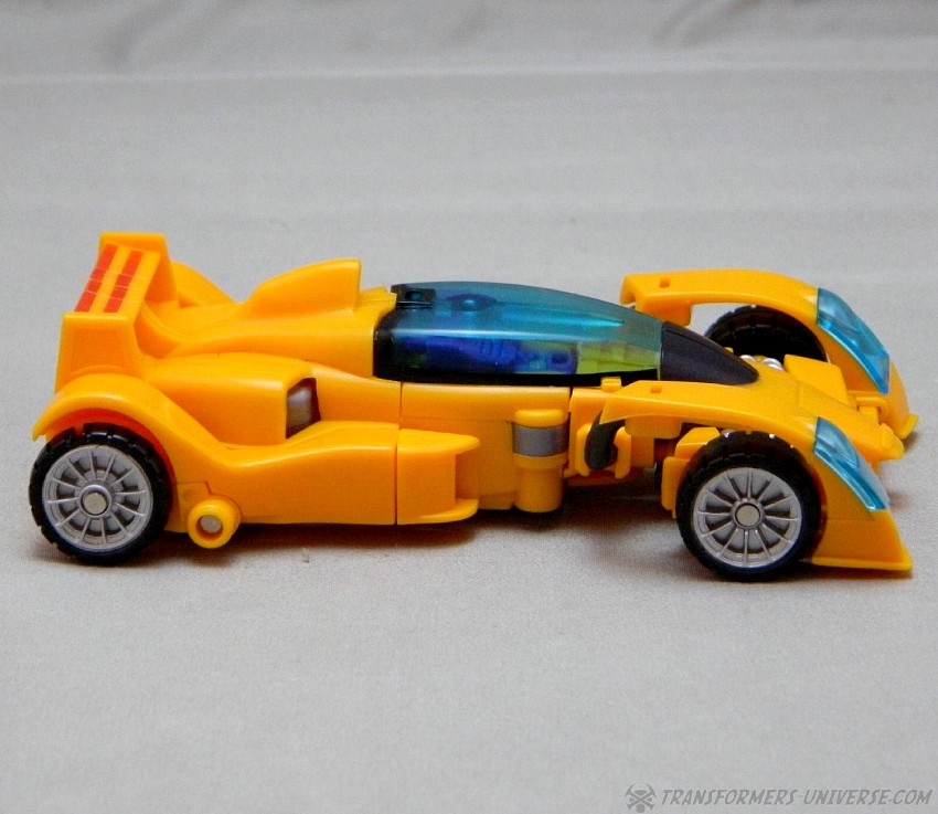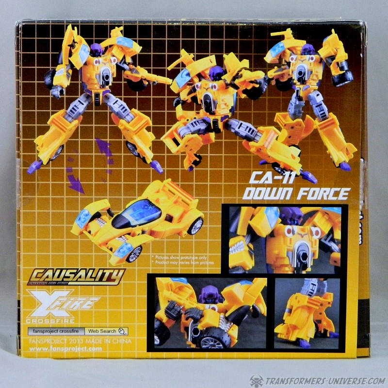 Remarks: The third figure in Fansproject third party version of the Stunticons is Down Force aka Drag Strip. Origin of the name: down force is the term of using wings and control surfaces on a car to press it down onto the street, making sure that it doesn't lose contact even at high speeds. Kind of fits with Dragstrip's F1 race car alternate mode. Down Force transforms from robot to car and becomes an arm (left or right) of the Intimidator (aka Menasor) combiner.