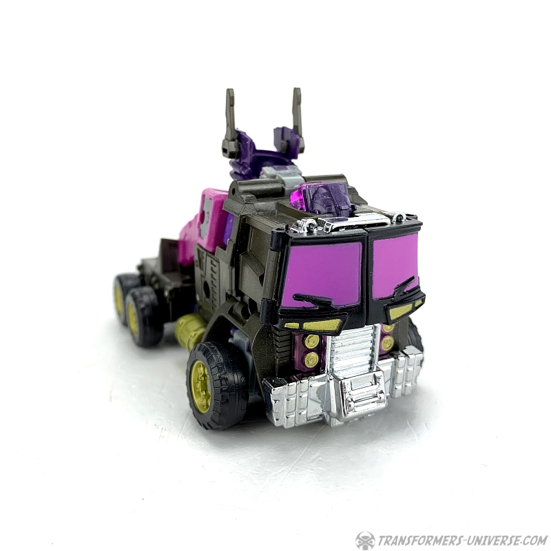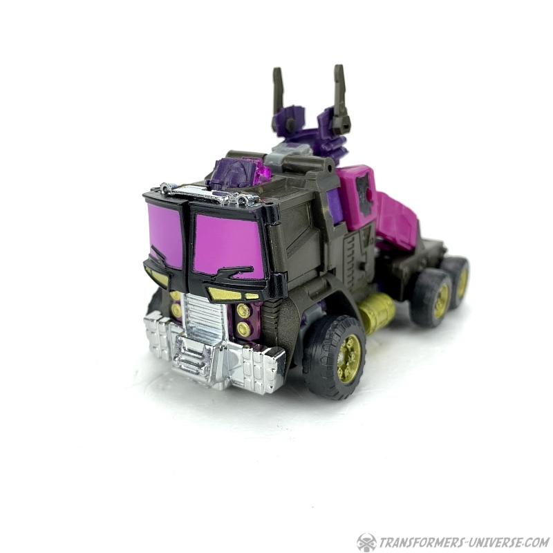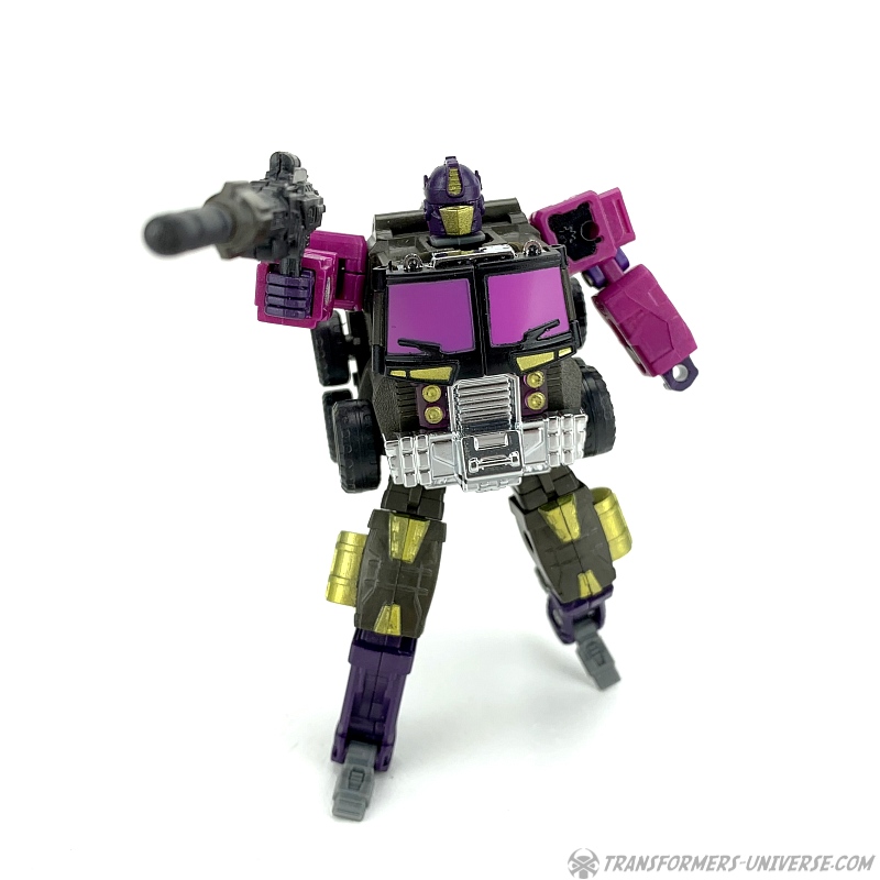 Nexus Omnicron: Nexus Omnicron is a scaled down version of Energon Optimus Prime with a new Shattered-Glass / Nemesis inspired paintjob. Nexus stands at about Scout-Class scale now, so he probably fits in with Legends-scaled third party toys (I have none, so I cannot really say for sure). Apart from size and paint, the toy is practically identical with the official Energon figure except in some small details. The Super-Mode helmet on Nexus’ back can’t fold out into an antenna-like thing and there are no electronics in the torso, unsurprisingly.