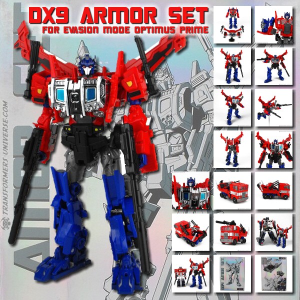 Prelude: The DX9 Armor Set is not a product released by Hasbro nor Takara-Tomy and thus not officially a Transformers item. It’s a third party upgrade set for Age of Extinction Evasion Mode Optimus Prime to turn him into a homage to Masterforce God Ginrai, but for legal reasons it can’t be called Apex Armor or God Armor.