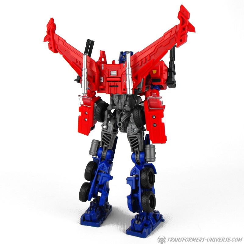 Robot Mode: The DX9 Armor Set contains a number of parts that apply to Evasion Mode Prime in robot mode. First, there is a new head, replacing EM Prime’s Movie-based noggin’ with a more G1-based one. You need a small screw driver to make the switch here, but it’s not terribly difficult. Next up you have a silver / chromed chest plate and a winged rucksack with smoke stacks, both of which attach easily and solidly.