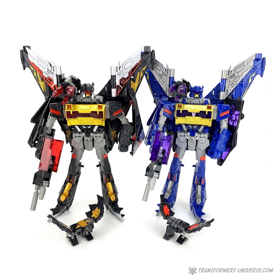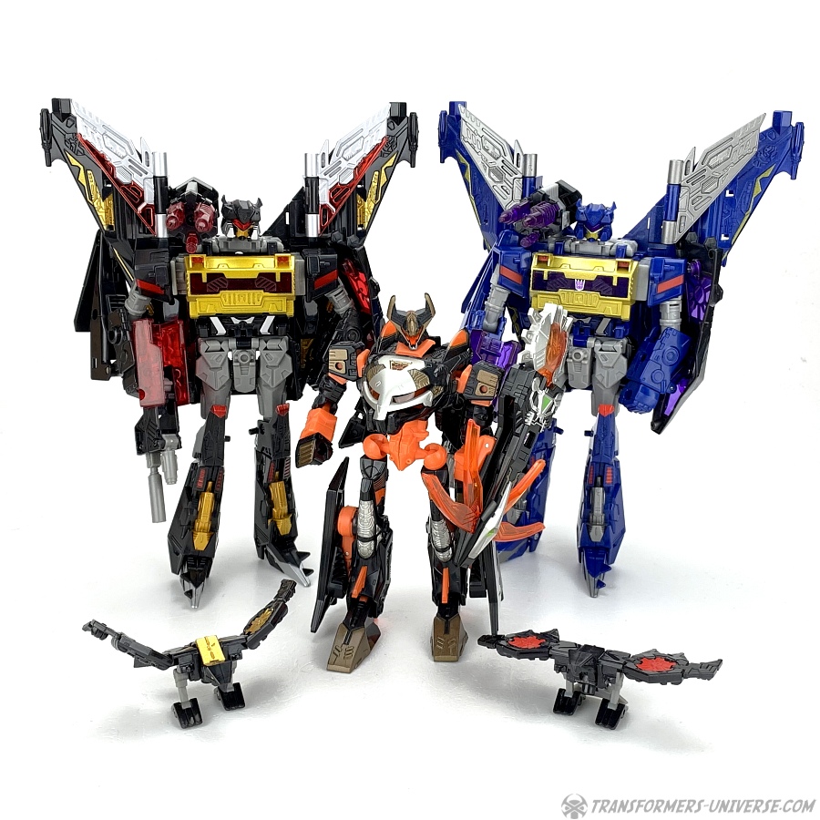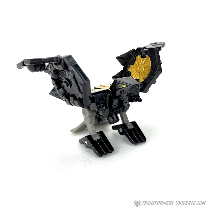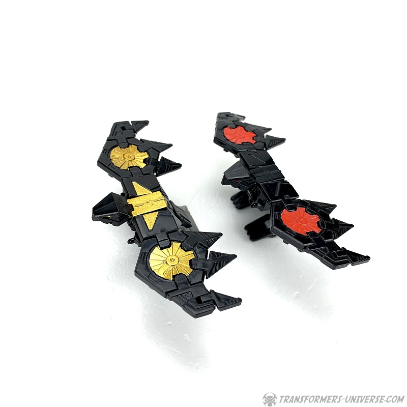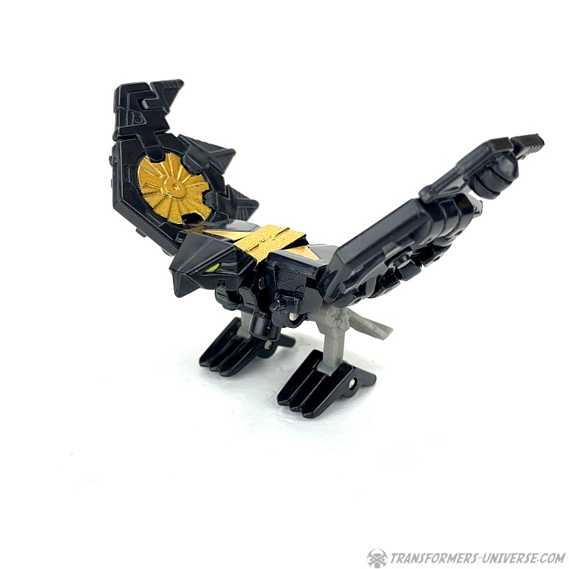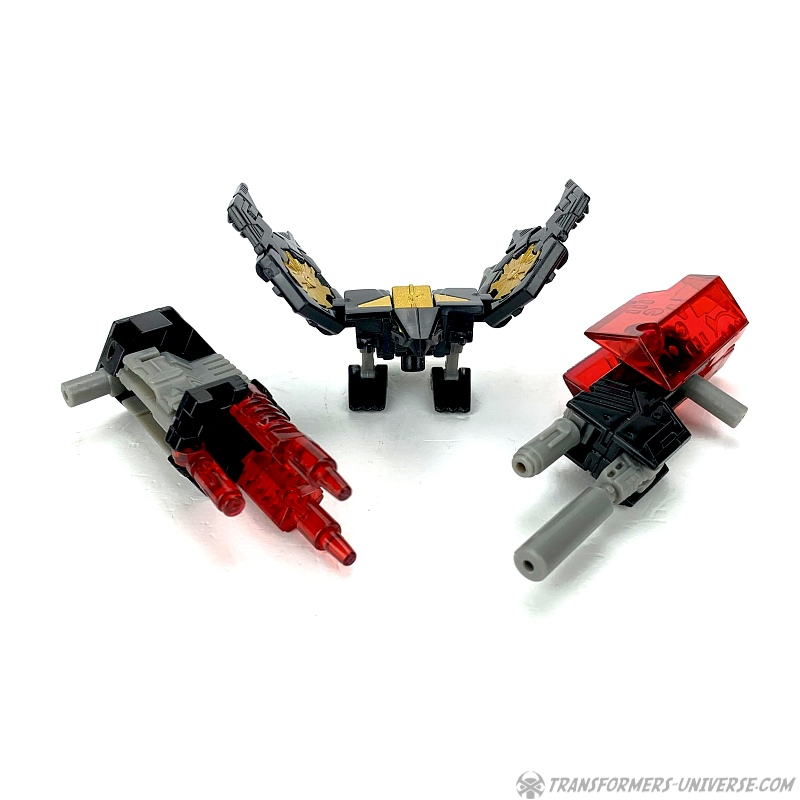 Partner: As mentioned above two of Soundblaster’s three bombs become his guns. The third unfolds into Hell Buzzsaw, a repaint of Cybertron Laserbeak. This is actually one of my all-time favorite Laserbeak/Buzzsaw molds. It looks great and it is insanely well-articulated. The wings alone contain five hinges each, head and tail move, the legs have articulated feet, simply awesome. Sure, his alternate mode is simply a hexagonal container, but how is that any worse than simply transforming into a square? So bottom line: one of the greatest versions of Laserbeak/Buzzsaw ever.