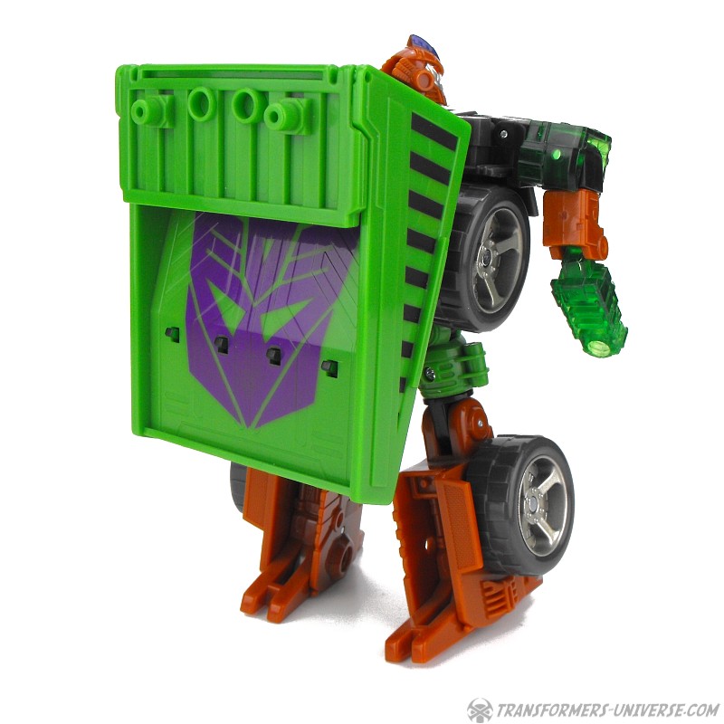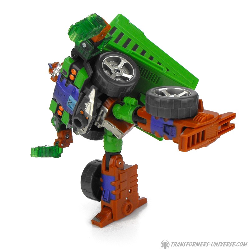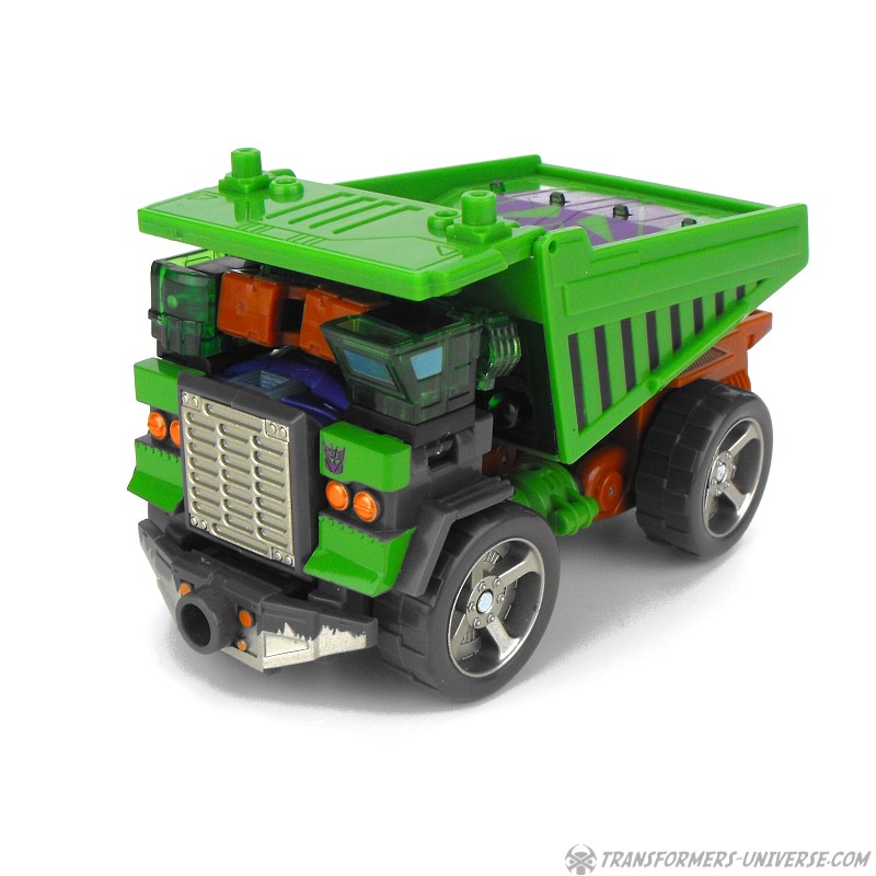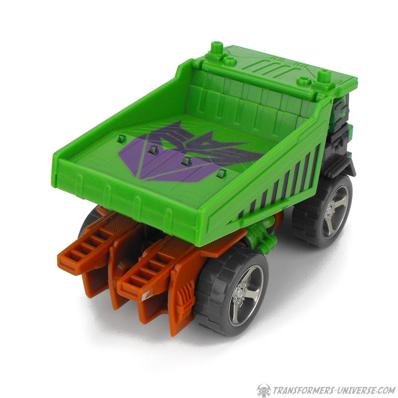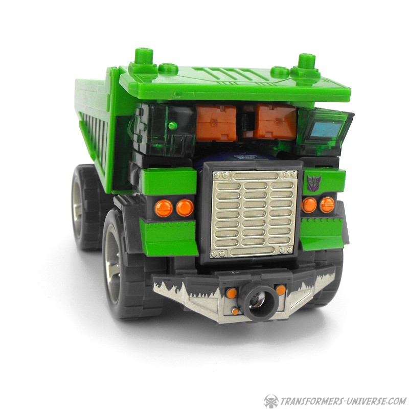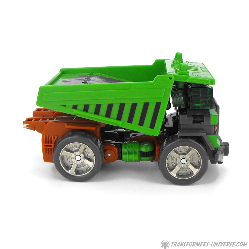Vehicle Mode: Demolishor transforms into a dump truck. Okay, there aren't that many dump trucks in Transformers history (Landfill comes to mind), but I have a hard time liking this mode. The driver's cabin is a cobbled-together mess from his arms and upper body and you can't put all that much into the back, reducing the play value. A below-average vehicle mode.