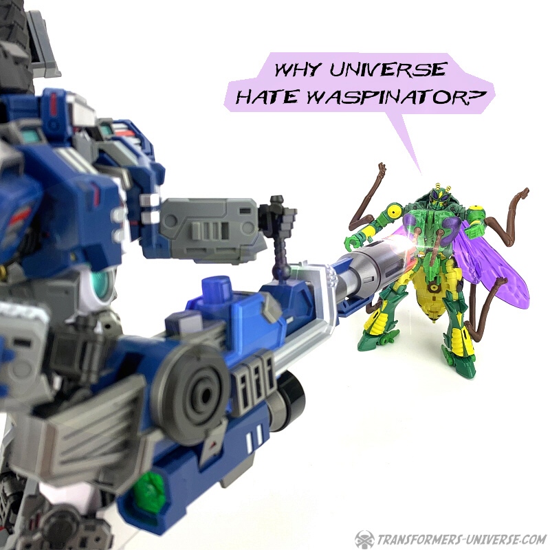 Prelude: Waspinator has plans! Waspinator wants to become franchise character like Opti-Bot and Barney-Bot! Waspinator also wants not to be blown apart all the time, but Waspinator knows universe hates Waspinator, so that’s not going to happen anytime soon. But Waspinator happy to have received new figure in War for Cybertron Kingdom line. So Waspinator will now say go!