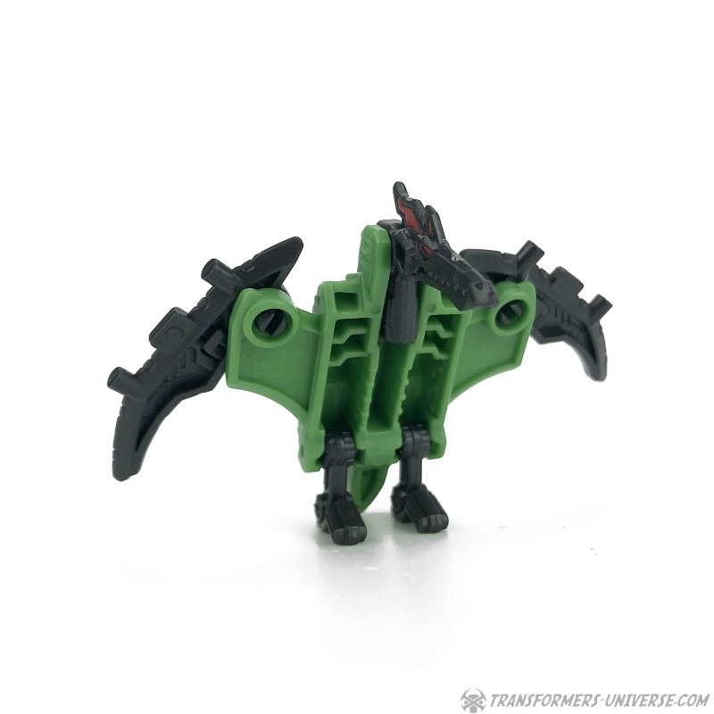 Robot Mode: Pteraxadon doesn’t have a classic robot mode as such. His “primary” mode, if you will, is a Pteranodon. His articulation in robot mode is pretty much identical to G1 Swoop. He can move his wings, nod his head, and somewhat move his little feet. You can pose him either standing or flying, he looks good either way. His feet are stable enough to perch him on the forearm of bigger figures and he is just an adorable little dino bird.